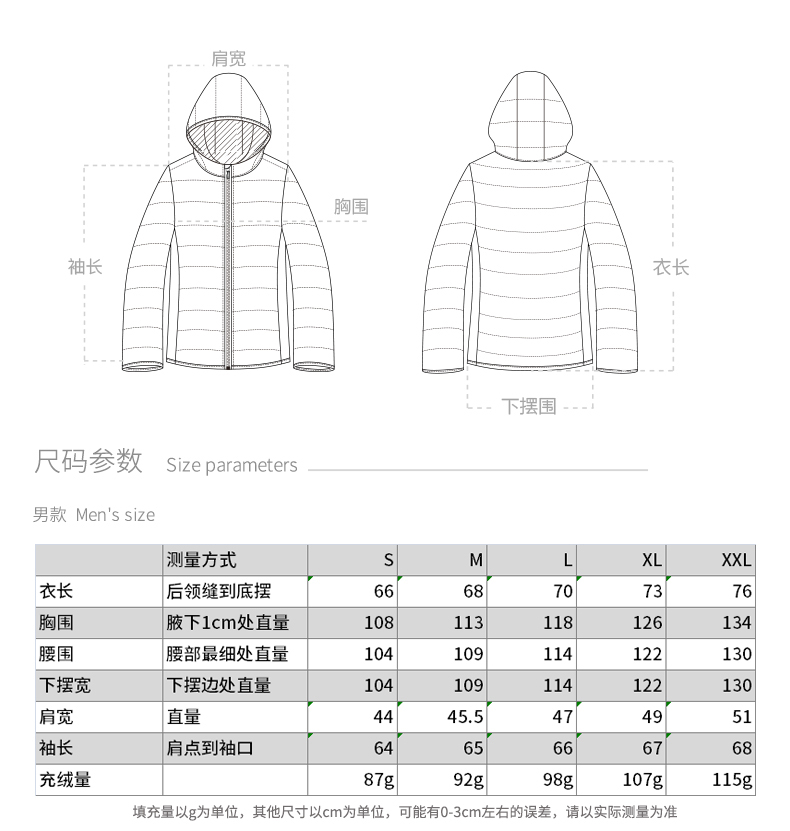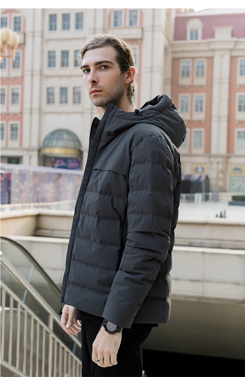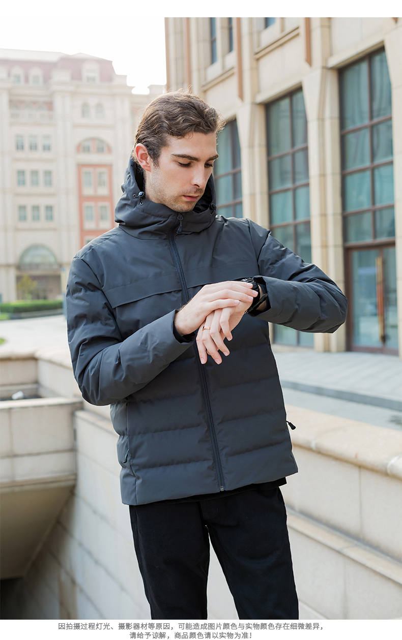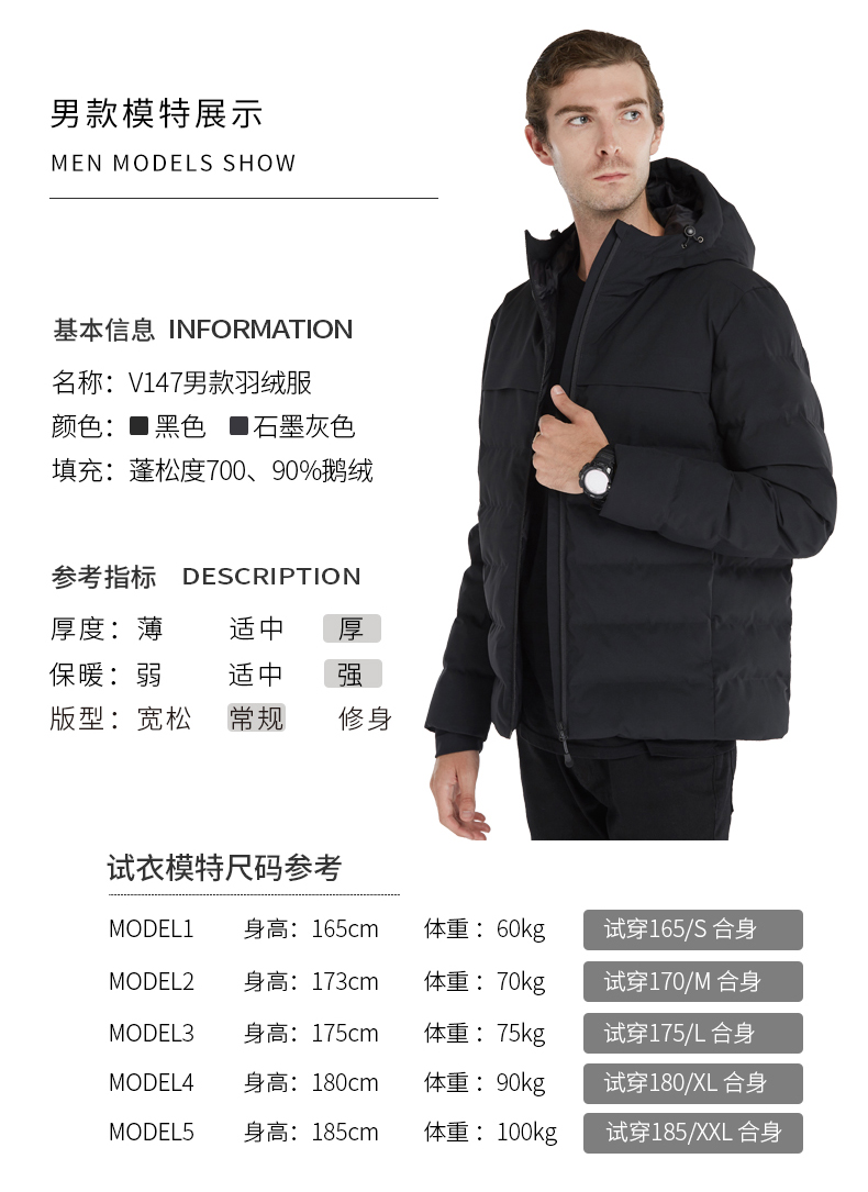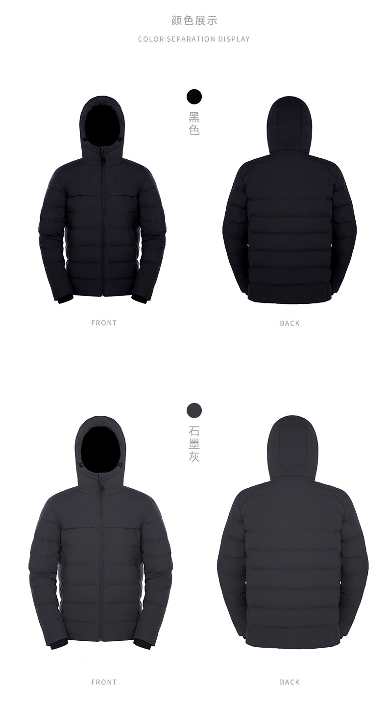 外观夹克型设计,上身利索不臃肿,短款版型显腿长,在帽口和下摆都设计了抽绳,袖口增加了一块弹力针织面料,都是防止寒风灌入,保证其保暖性,所有口袋的拉链都是YKK拉链,顺畅耐用,线材也都是选用的美国A&E公司的缝纫线,最大程度的防止钻绒,力求每个细节都完美。