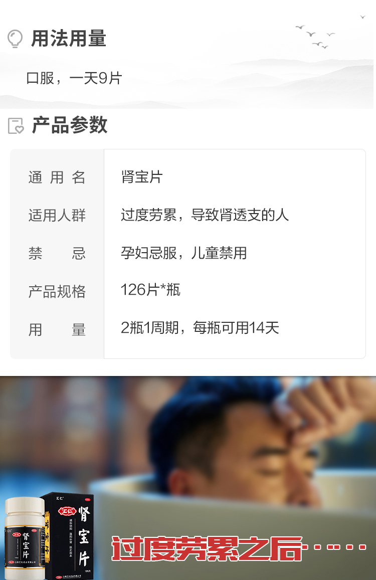 汇仁肾宝片是汇仁专为男性设计,用于补充“肾透支”、“性透支”的补肾中药。适用于腰酸背疼,夜尿频多,肾虚腰酸等肾亏的症状。因为价格较贵,所以有很多仿冒的现象,购买时一定要选择靠谱渠道,不要只贪便宜。