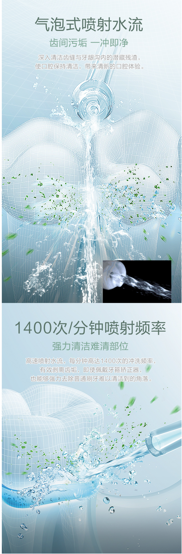 气泡(轻柔)模式:适用于牙齿敏感人群,使用轻柔气泡水,轻柔的按摩牙龈。