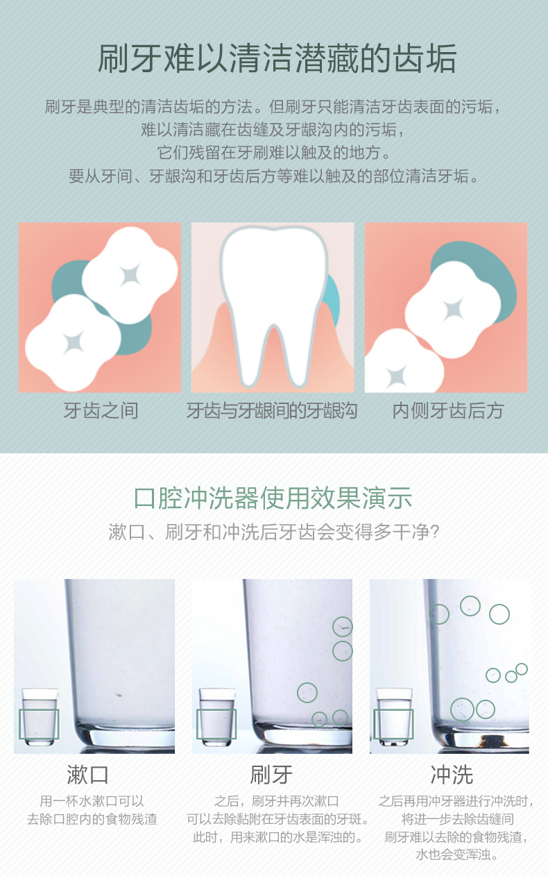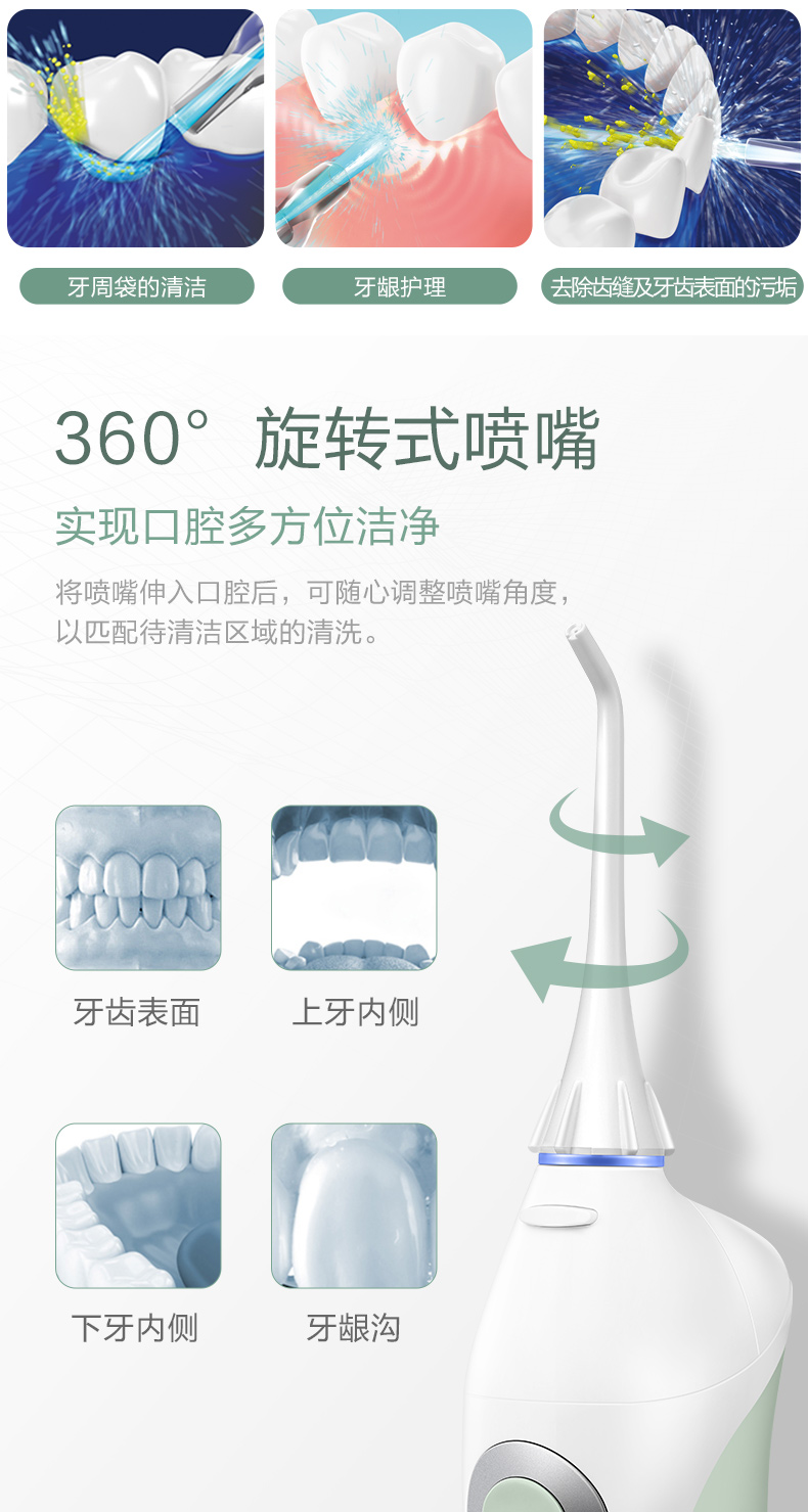 喷射模式:强力水流冲洗牙齿表面,佩戴牙箍也可以有效清洁。