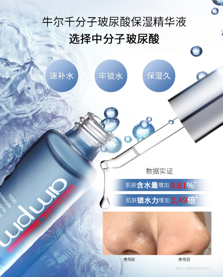 这款牛尔千分子浓润玻尿酸保湿精华液不仅使用了能深层补水的中分子玻尿酸,添加浓度也多于其他品牌但不会粘腻,更补水好吸收。单用可以维持肌肤油水平衡,混搭使用还能帮助其他单品更好被吸收。