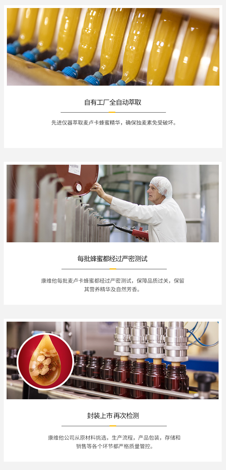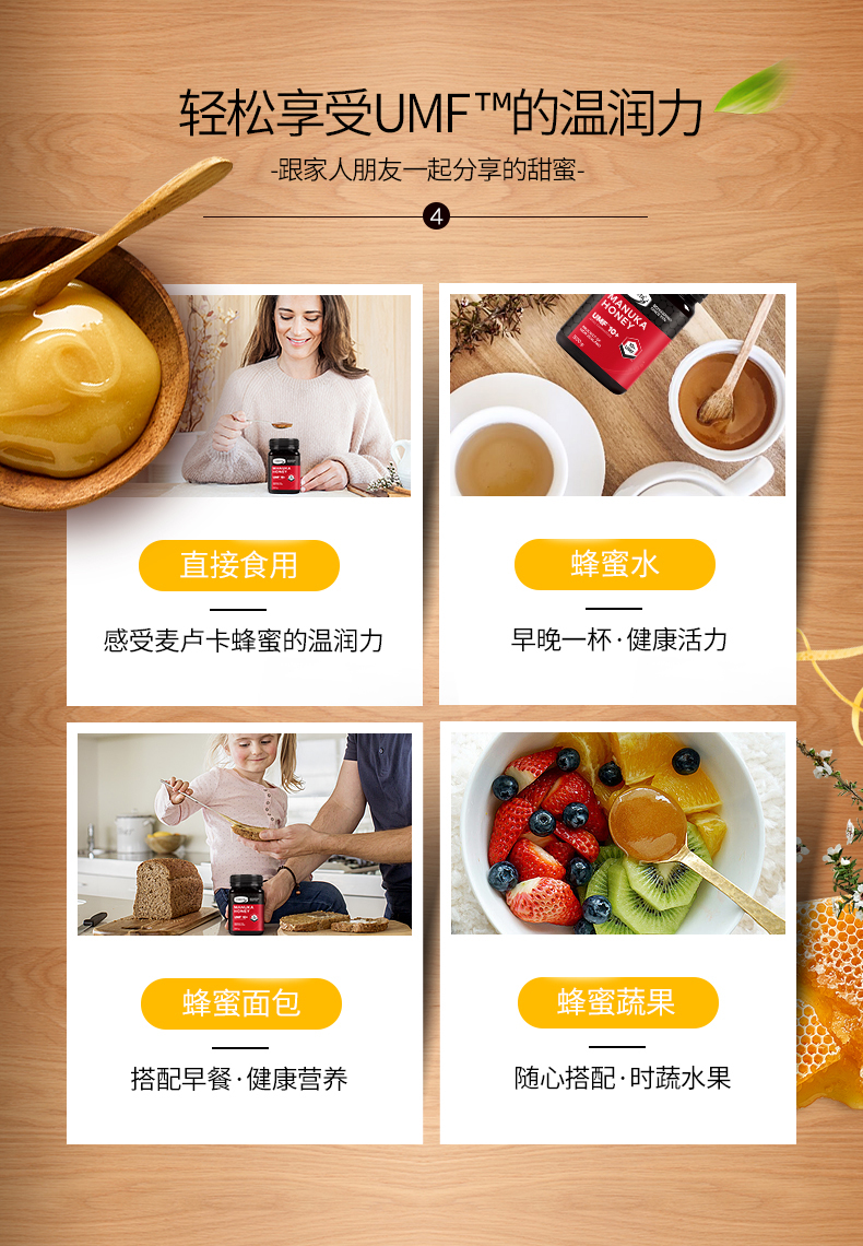 其强大的治疗功效在新西兰和澳洲均已得到广泛的临床证实,在美国更是蜂蜜中唯一准入药品市场的添加成分麦卢卡蜂蜜中,含有一种抗菌因子-麦卢卡因子,有良好的抗氧化能力,可以促进伤口自然愈合,尤其在对调养诸如慢性胃炎、幽门螺杆菌、胃溃疡等胃肠道疾病上效果非常好。