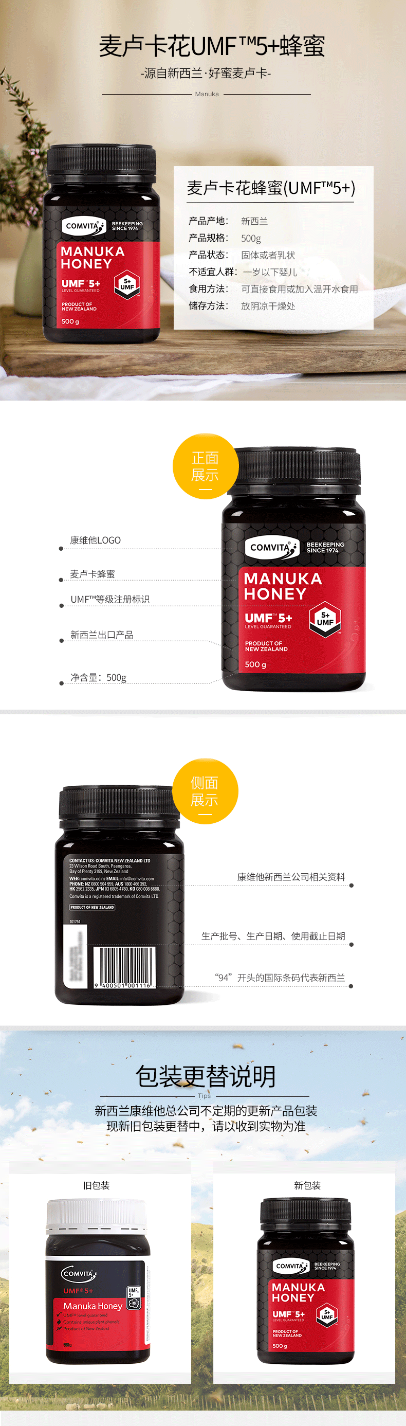 这款康维他Comvita麦卢卡蜂蜜,新西兰原装进口,UMF是5+,适合日常养胃,温润肠道,促进消化食用。