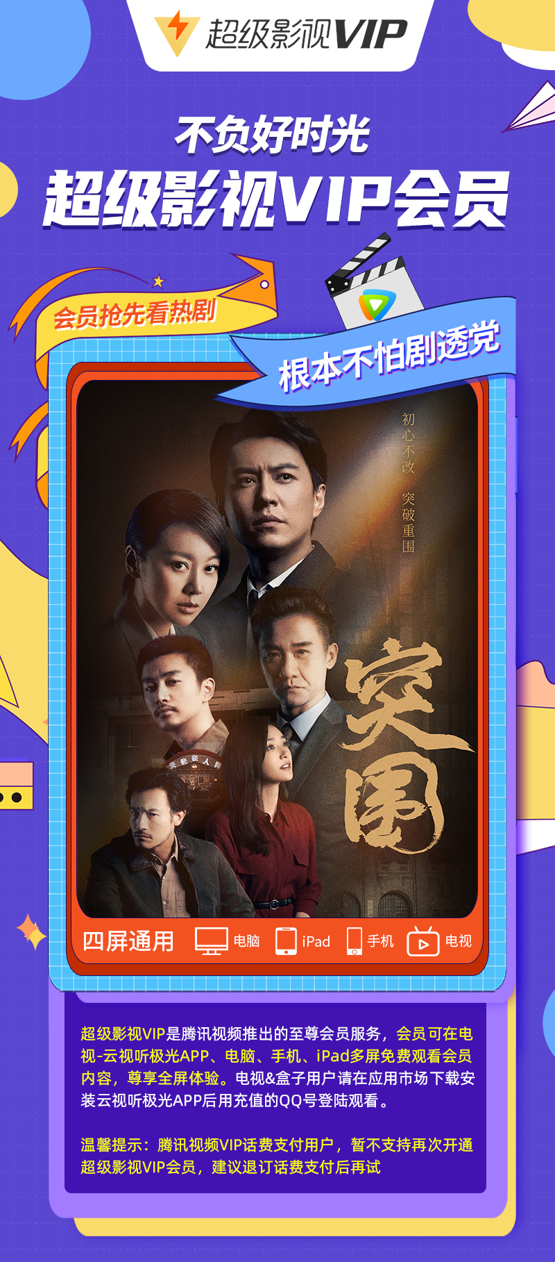 2.腾讯视频超级影视VIP支持电脑、平板、手机、电视、盒子。
