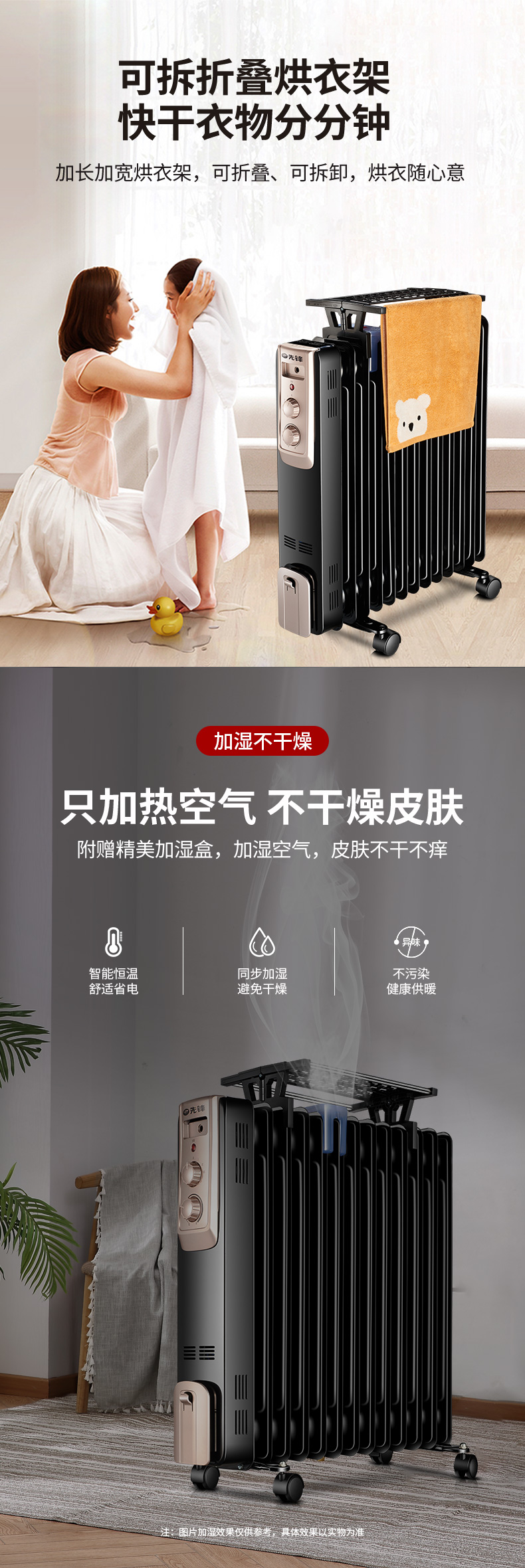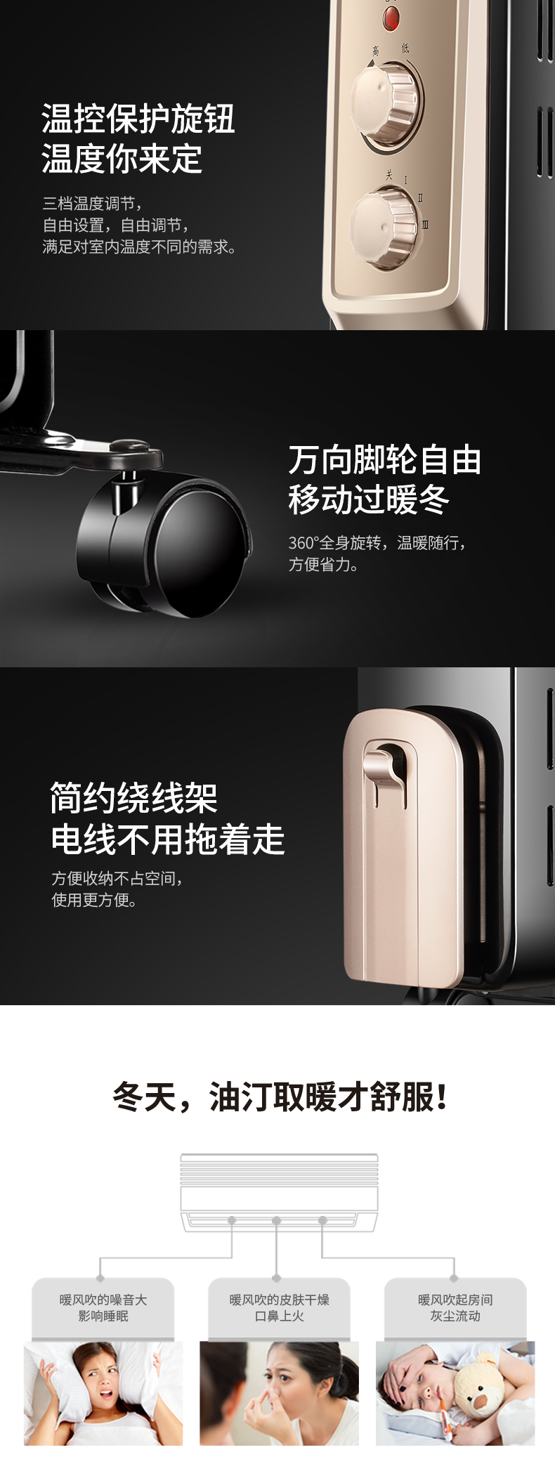 拥有智能恒温系统,当温度高于设定温度时自动断电,倾倒≥30°自动断电、使用安全有保障,电油汀优点是无光、无声、直接加热空气不干燥。日常使用还可烘干衣物等。