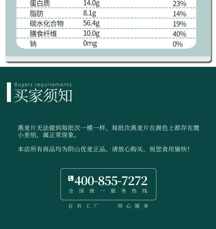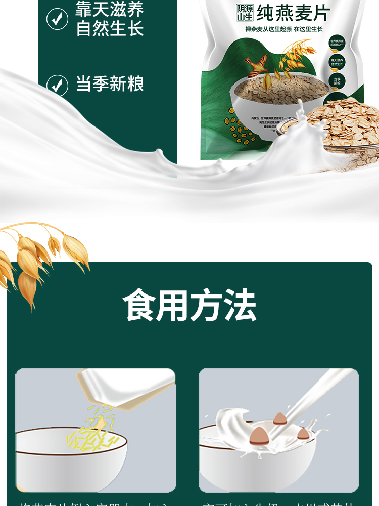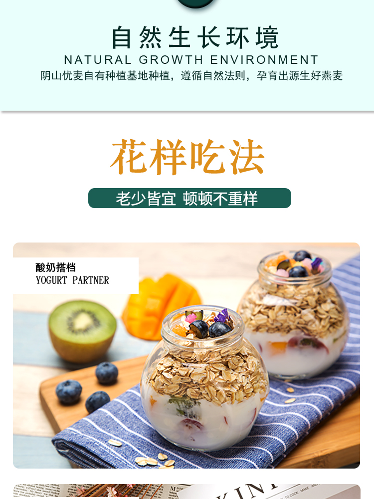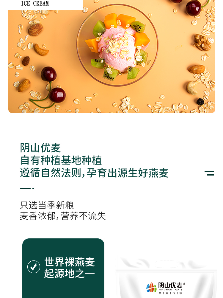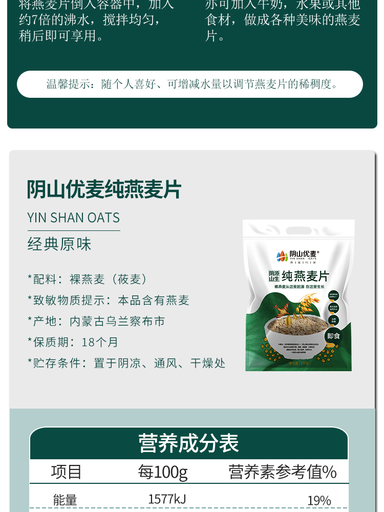 这款阴山优麦的有机燕麦片,来自世界燕麦5大产区之一——内蒙古乌兰察布,自有种植基地,坚持全有机种植,纯裸燕麦片,无农残,无添加,切粒碎片,到手后用燕麦体积约7倍的沸水冲泡3分钟即食,营养全面吸收。