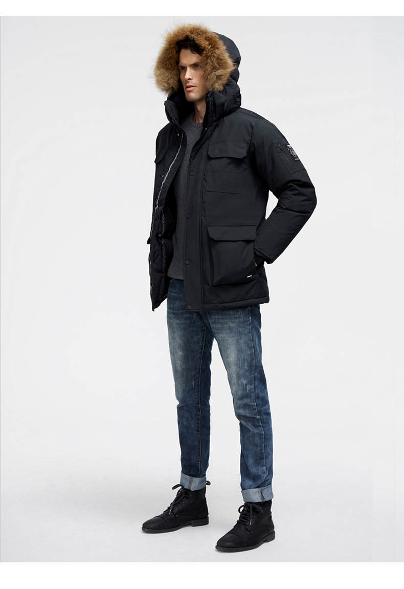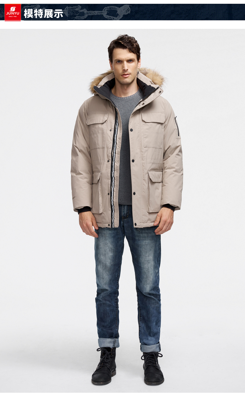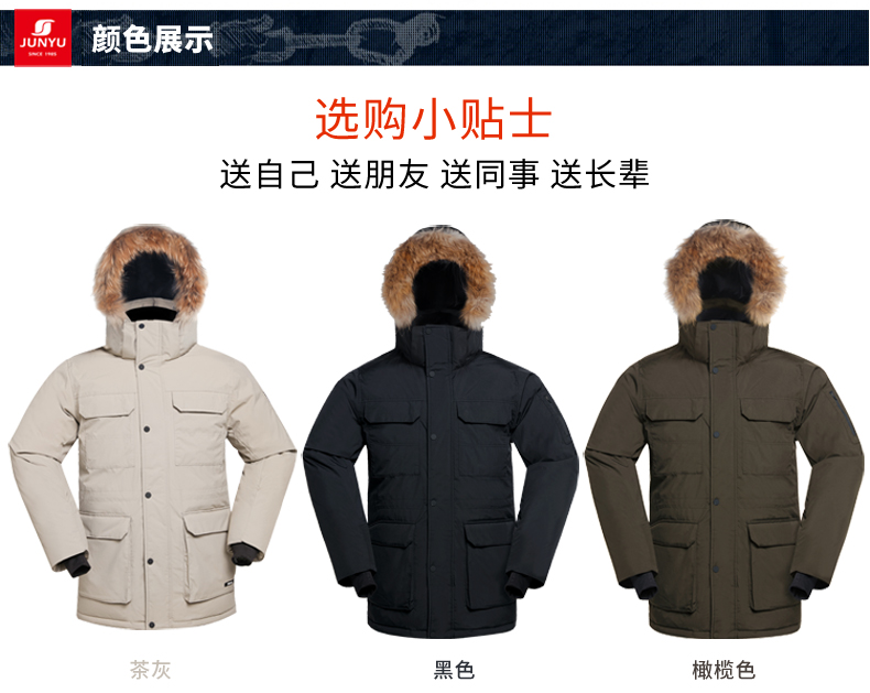 这款君羽寒峰男中长款羽绒服,属于极寒系列,可抗-30℃~-40℃,是2018年的冬季款,内里填充了800蓬90%鹅绒,L码充绒300克,属于超重装羽绒服。外层是高密度耐磨锦纶布,伴有压胶加持,可防风防雨雪。工装风款式,长度过臀及大腿。