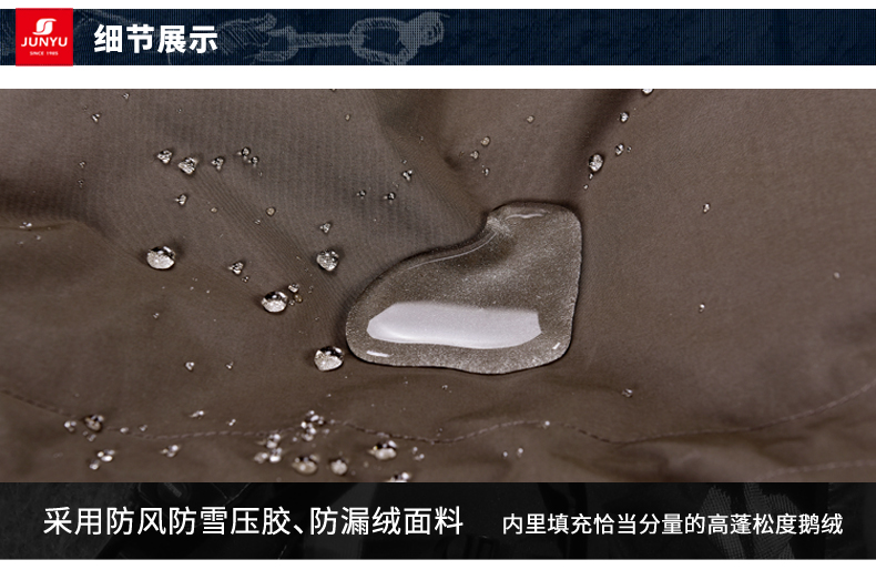 「防钻绒处理」面料与填充的羽绒,使用先车出羽绒隔舱,后充绒的方法,在制作外层面料过程中,羽绒隔舱就预先织出来,后填充羽绒,这样可有效避免羽绒从针眼钻绒。