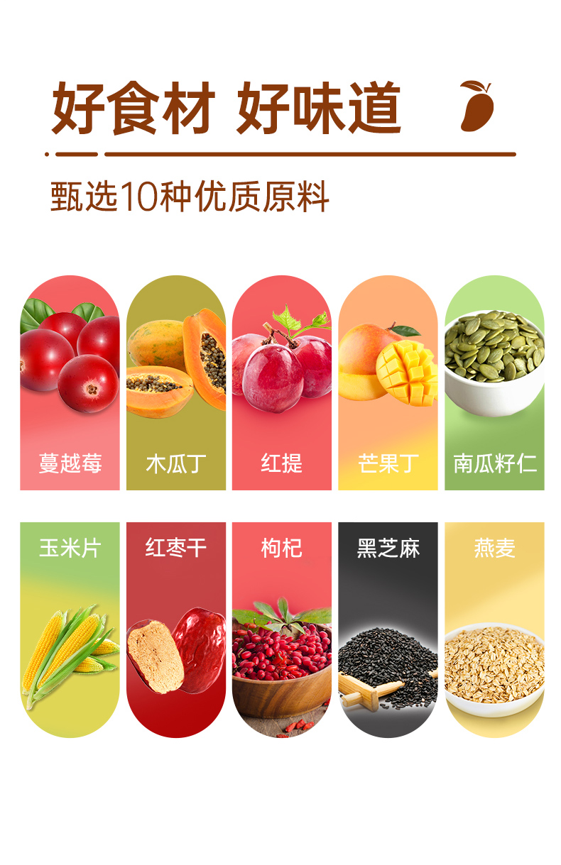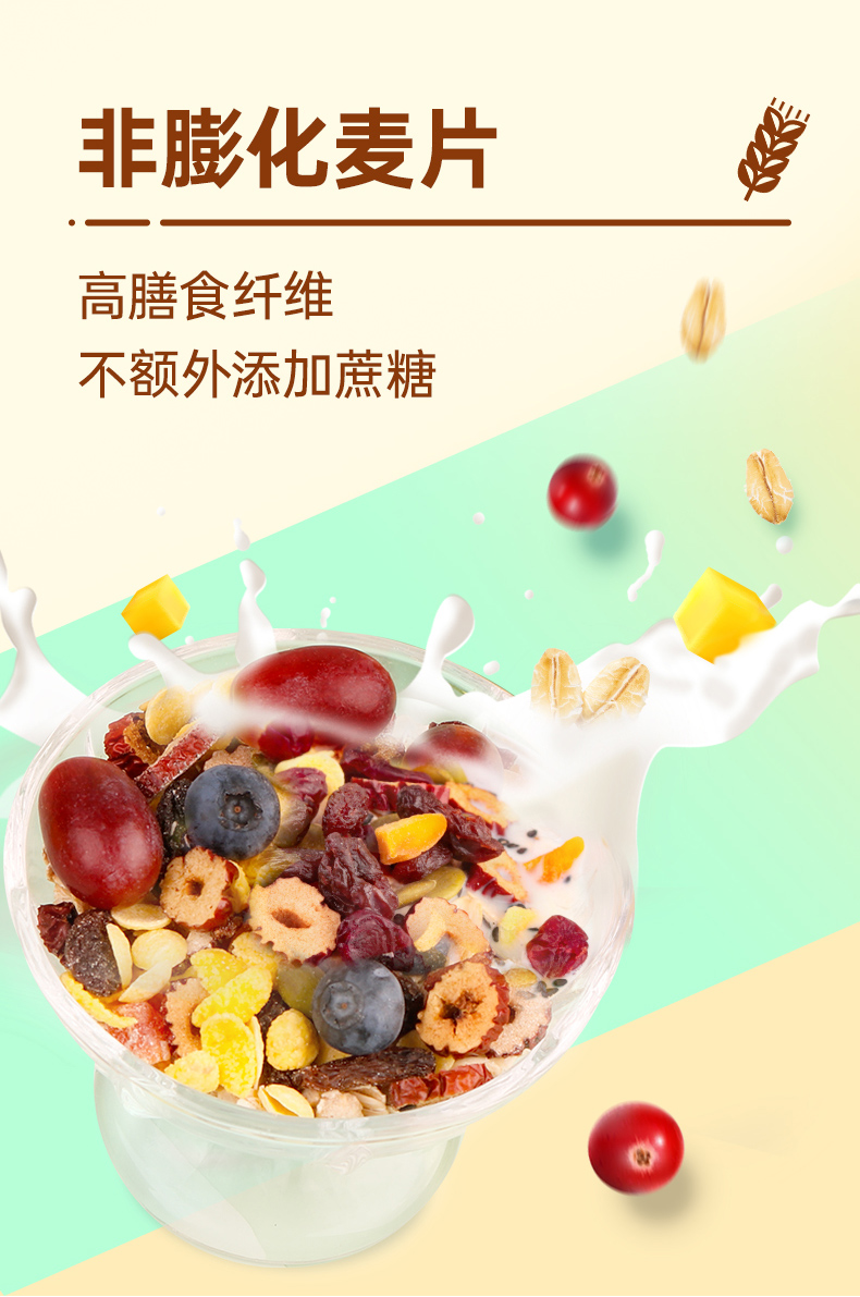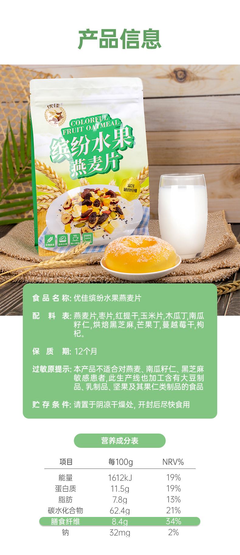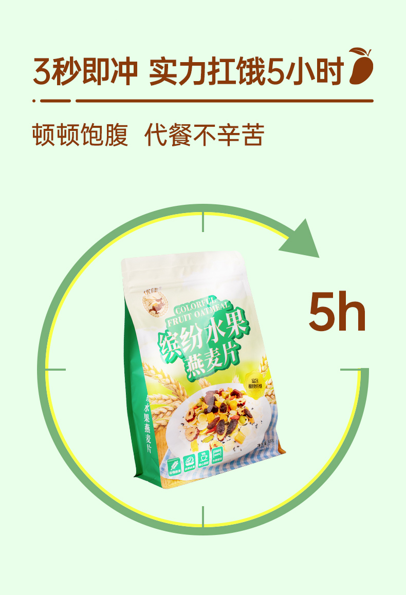 这款优佳 即食冲饮 缤纷水果燕麦片,水果谷物搭配配方,使用非膨化麦片为主料,富含膳食纤维易饱腹,搭配蔓越莓、木瓜丁、红提、芒果丁、南瓜籽仁、玉米片、红枣干、枸杞、黑芝麻,不额外添加蔗糖,营养均衡,不含人工添加剂,适合健身代餐。