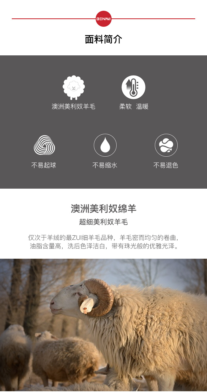 美利奴羊毛产自美利奴绵羊,是除羊绒外最细的羊毛品种,以新西兰和澳大利亚高山美利奴羊毛最优。美利奴羊毛不但比普通羊毛保暖更好,质轻柔软柔韧,光泽良好,拥有优良的垂坠感,还进化出天然的防紫外线护功能。