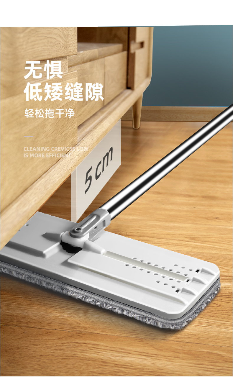拖杆长达1.27m,配合省力滑轨,上下洗脱时无需弯腰更省力;拖把头可360°灵活旋转,可自由穿梭于家居底部。