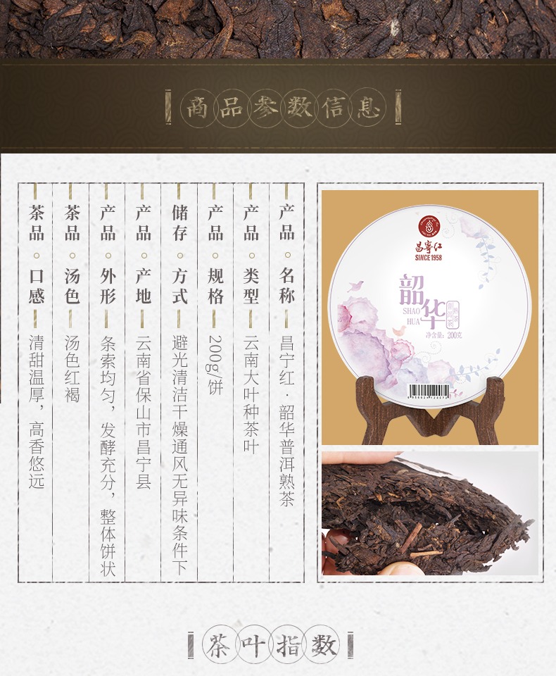 这款普洱茶产地为云南昌宁,由临沧茶区大叶种茶发酵而成,茶饼紧结;茶汤红褐通透,口感清甜温厚,陈香浓郁;叶底油亮,数泡仍有余香。规格:200g。领券链接点此
