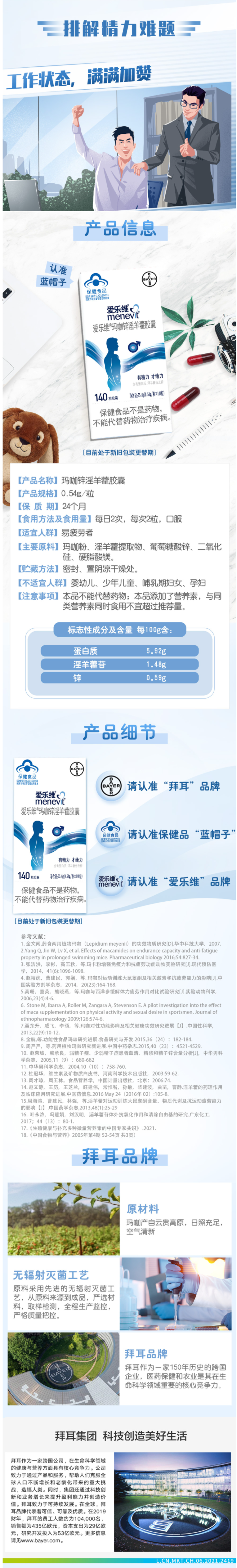 这款爱尔维玛咖锌淫羊藿胶囊是专为男性设计,是以玛咖粉、淫羊藿提取物、葡萄糖酸锌、二氧化硅为主要原料制成的保健品,具有缓解体力疲劳,提高精子活力的效果。规格是140粒/瓶,用法用量:1日2次,1次2片。