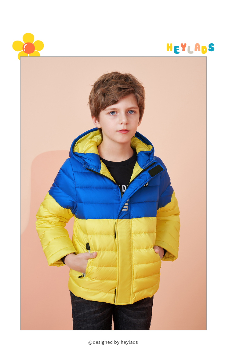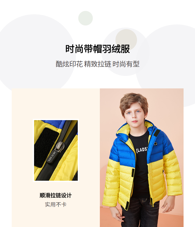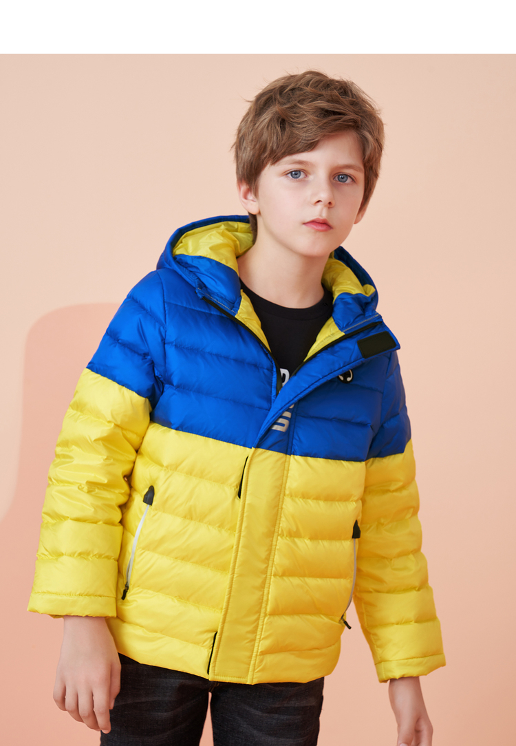 这款男生女生 男大童冬季时尚轻薄短款带帽撞色羽绒服,优质面料,健康安全,舒适有型,耐穿不易皱,80%含绒量,连帽设计,保暖舒适防风;酷炫印花,时尚有型;拉链口袋,方便实用;精致贴标,简约不简单。