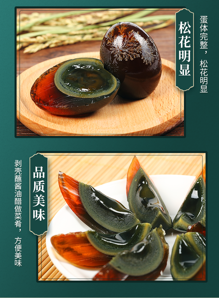 手工秘制,无铅工艺,操作简单,品质口感极佳,营养美味,色泽完美,层次分明。溏心皮蛋包泥疏松,色浅,易剥落。天气渐热,皮蛋非常适合凉拌做凉菜等,美味爽口,下酒好菜,还可以煮皮蛋瘦肉粥等,别有风味。