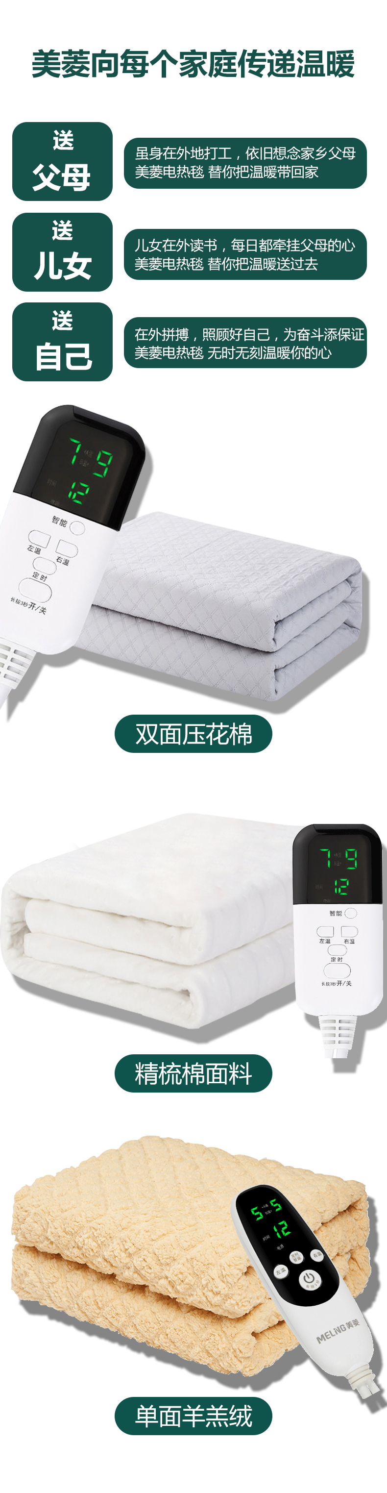 智能恒温降档 防潮防湿,不干燥不上火。韩国点焊精梳棉面料,此外还有双面压花棉质面料,多尺寸、智能降档控温遥控可选。