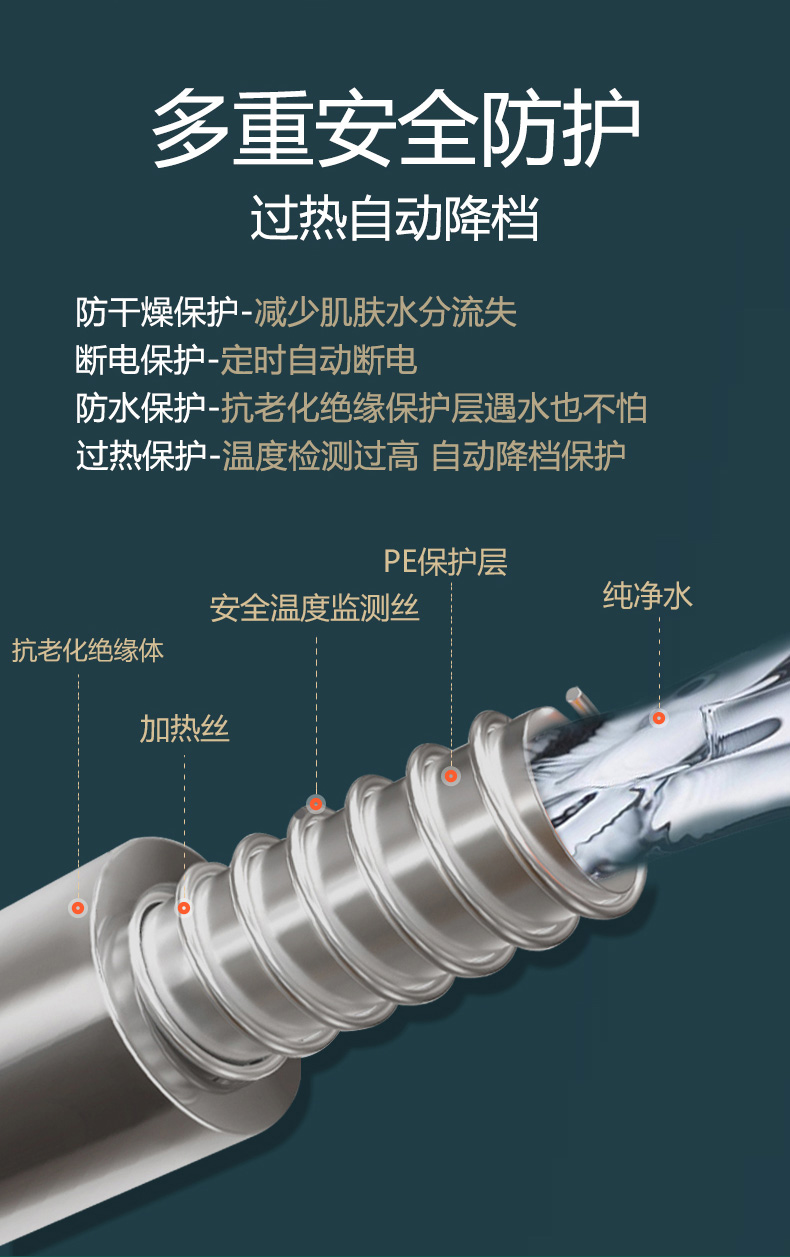 细节上:注水口可拆卸封盖,安全不漏水;接线处灌胶,遇水不漏电,有高温过热自动断电保护成人孩子都能用,由于防水,即使孩子尿床也不怕;1-12小时随意定时,到时自动断电,9档温度随意调控。