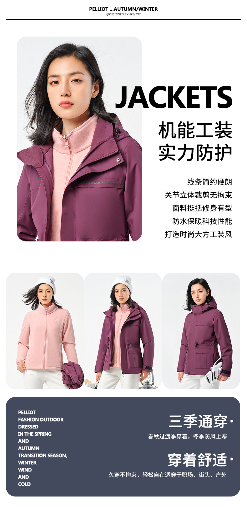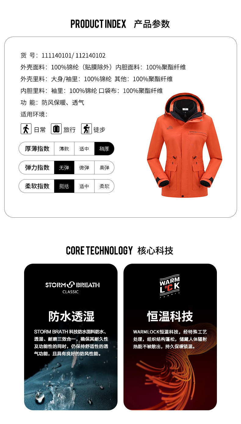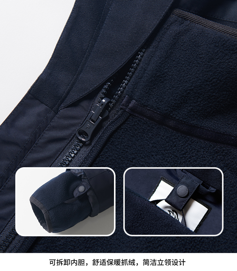 这款冲锋衣为今年新款,机能工装风设计,线条简约硬朗,上身挺括有型,科技面料增加了穿着的舒适性,防水指数5070,透气指数10600;内搭280高克重摇粒绒内胆,双刷双摇工艺,绒粒蓬松柔软,蓄热保暖,科技御寒,一衣三穿,日常出行、户外出游适合多种场景。