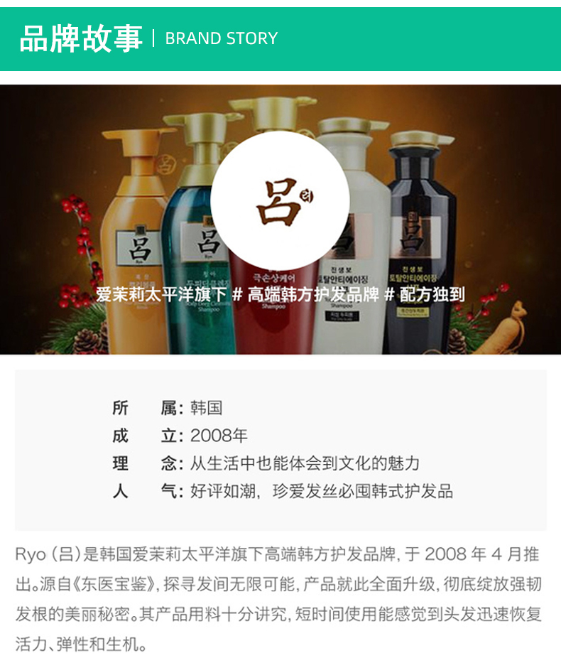 吕是韩国爱茉莉集团的中高端洗护品牌,所有洗护系列均以汉方为基础,具有去屑、防脱发功效,是韩国7年销量第一的洗发水。
