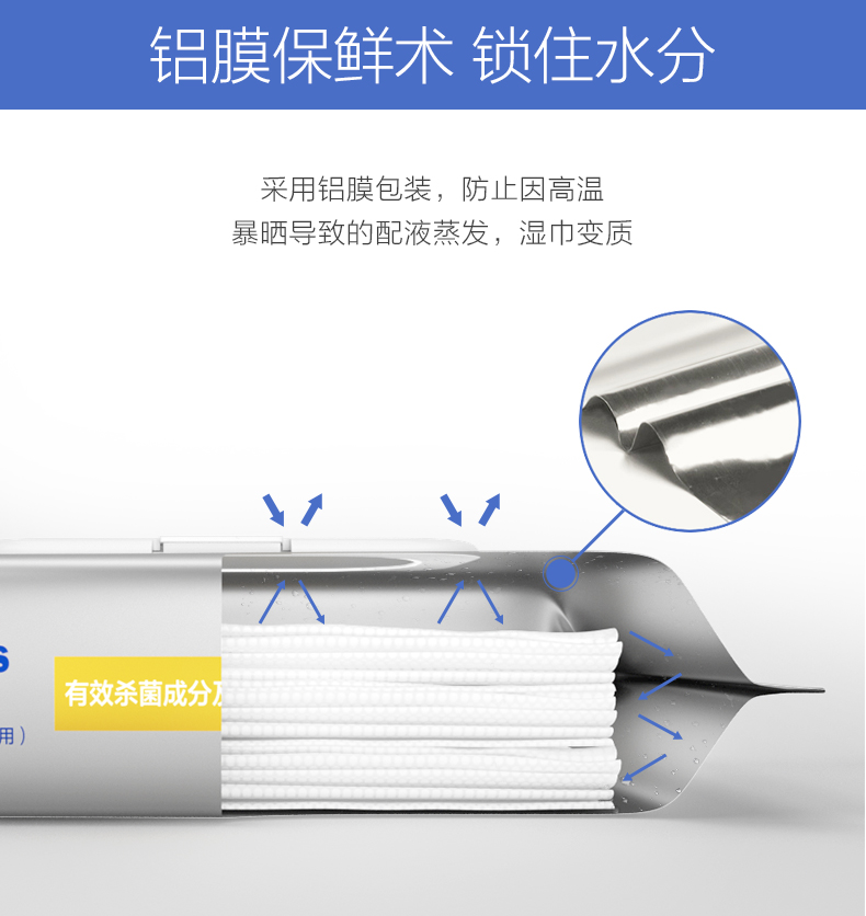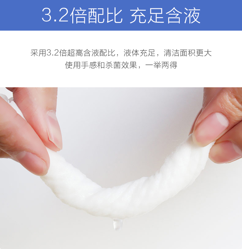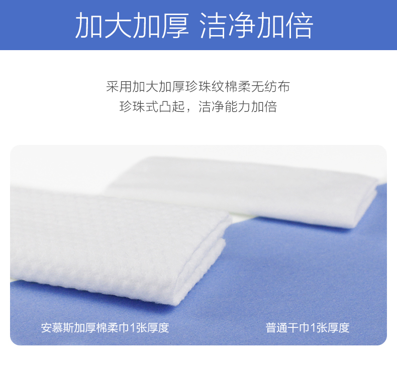 采用加大加厚珍珠纹棉柔无纺布,珍珠式凸起,洁净能力更强。外壳是铝膜包装,可防止因高温暴晒导致的配液蒸发,让湿巾变质。单片湿巾的尺寸是160*180mm。