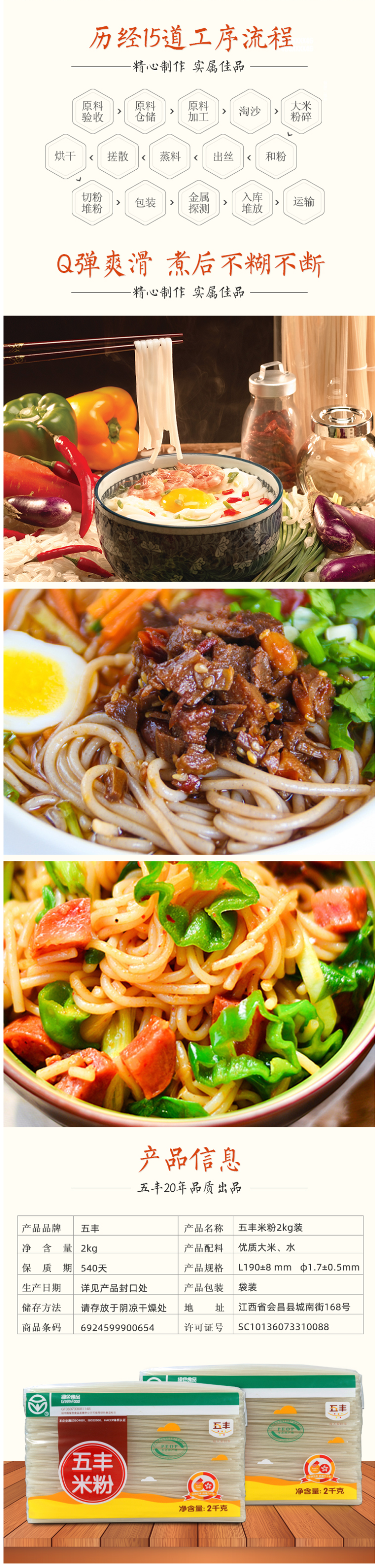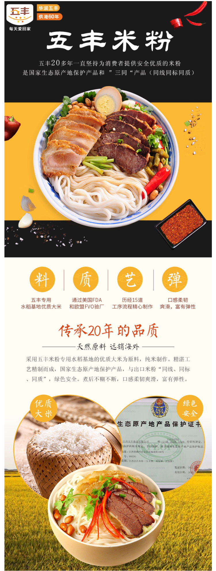 这款五丰米粉,选取专用水稻基地的优质大米为原料,纯米制成,是国家生态原产地保护产品,与出口米粉“同线、同标、同质,零添加,绿色天然。