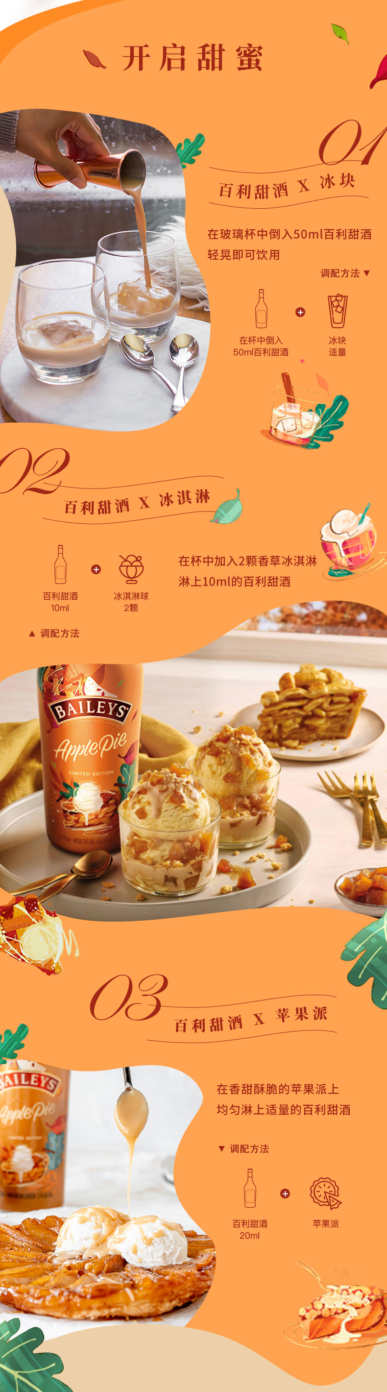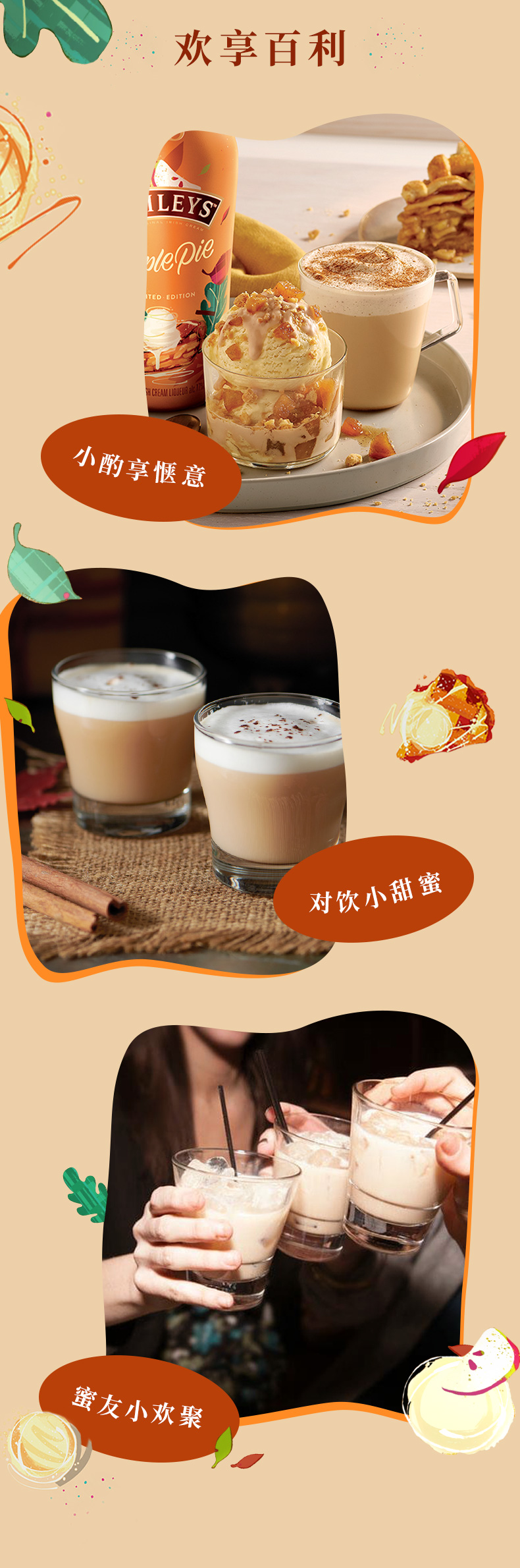 BAILEYS 百利甜酒 苹果派味,百利甜酒由蒸馏师挑选陈年,三年以上的爱尔兰威士忌和奶油融合而成,经由独特工,艺与精心调配,带来曼妙的,味觉体验。为呈现经典甜点苹果派的甜蜜馨香,百利苹果派味甜酒,自成一派,为你带来独特味觉享受,无需烘焙,随时感受,“新鲜出炉”的暖心蜜意。