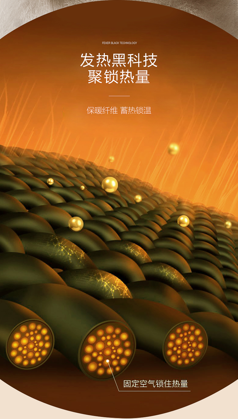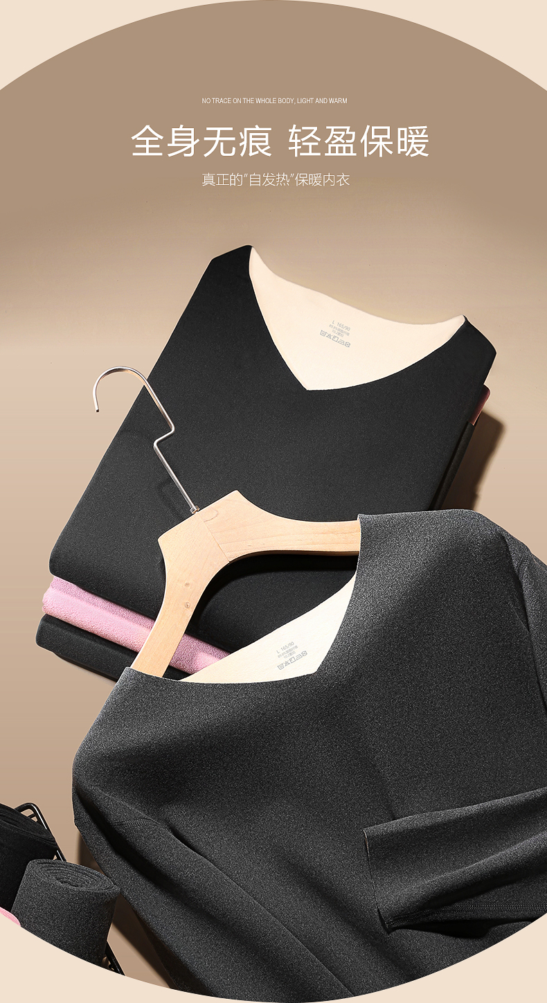内衣采用发热科技面料,锁住热量穿着轻暖舒适,面料成分为90%聚酯、混入9%的氨纶增加弹力,面料弹力大,穿着贴身不易变形,AB双面磨绒,亲肤柔软,有优良的吸湿透气性,无痕工艺,可随意裁剪,秋冬穿着打底无痕。