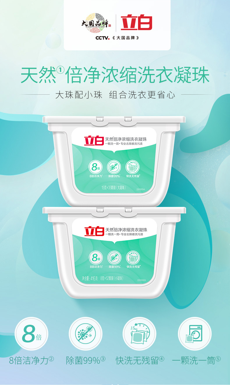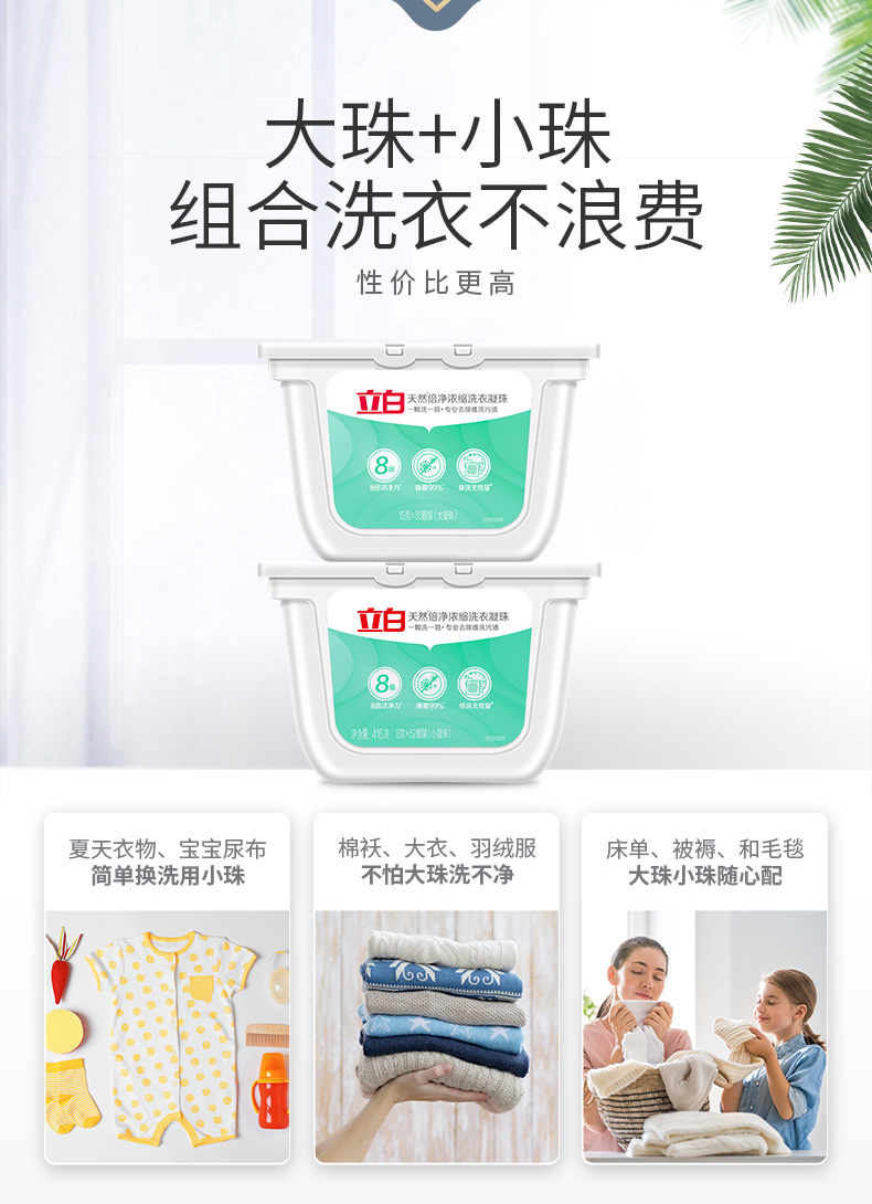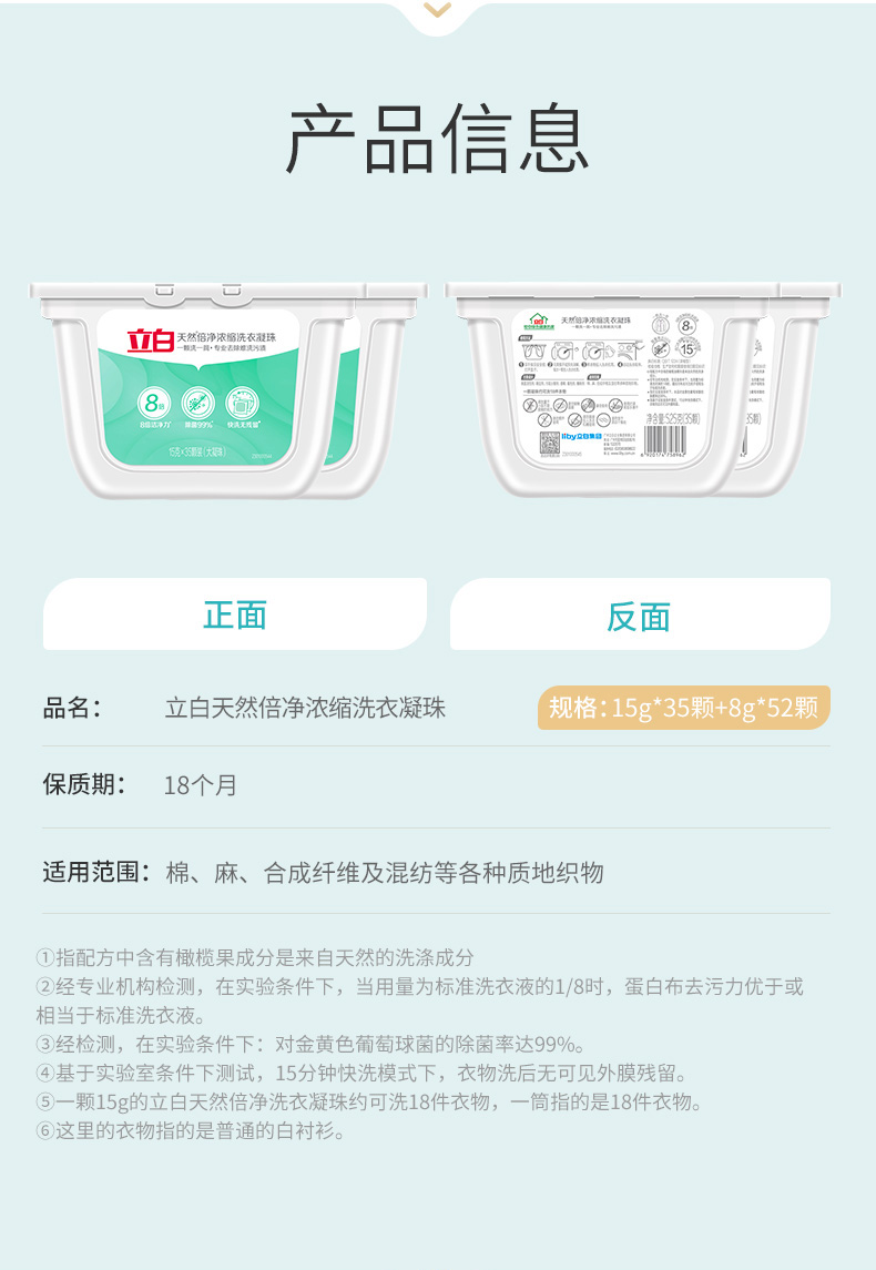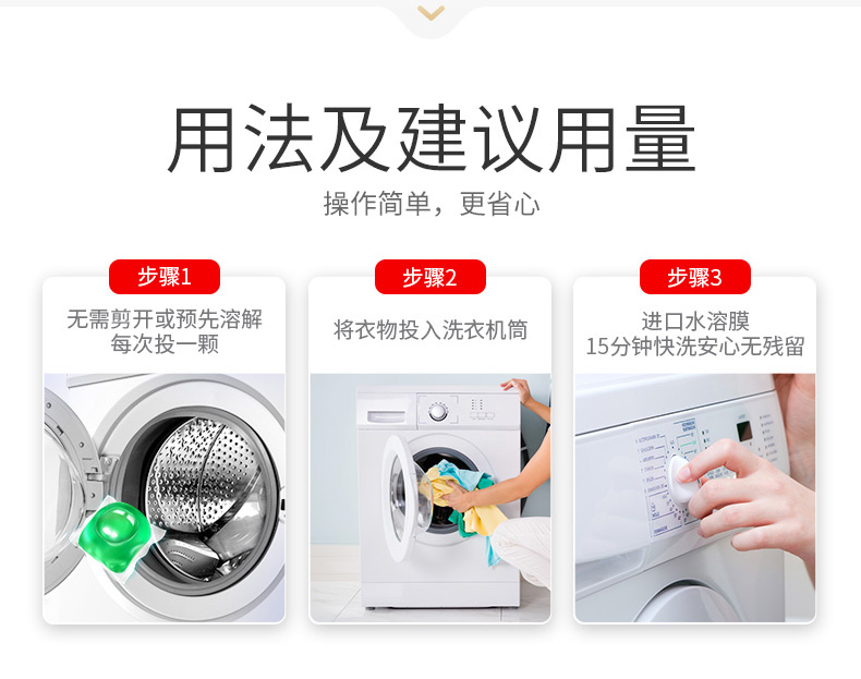 遇水即溶,低温也能溶解不残留,省心简单实用,8倍洁净力,99%除菌,高效去污,快洗无残留,植物活性剂配方,深层洁净,保护衣物纤维,水溶性外膜,洗后柔顺亮丽,清雅幽香,去除异味,留香悠长。适用于棉麻、混纺、合成纤维等质料衣物。