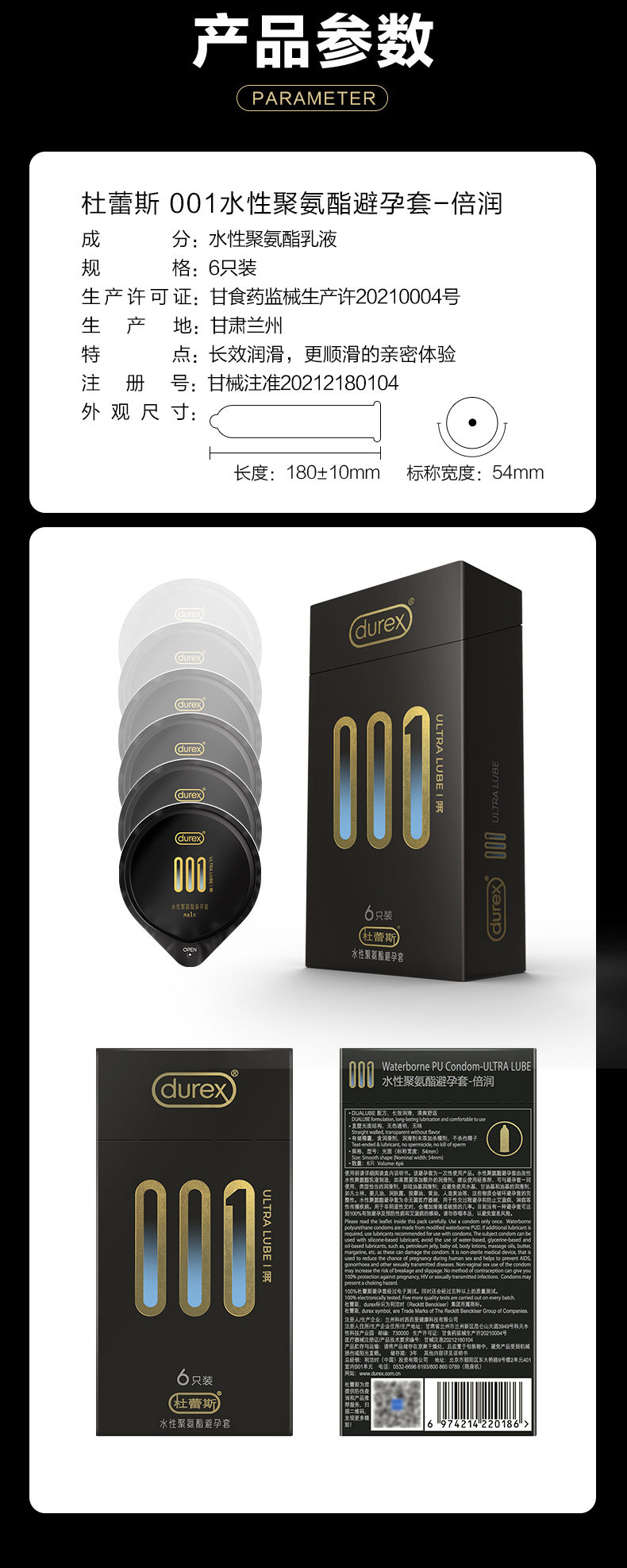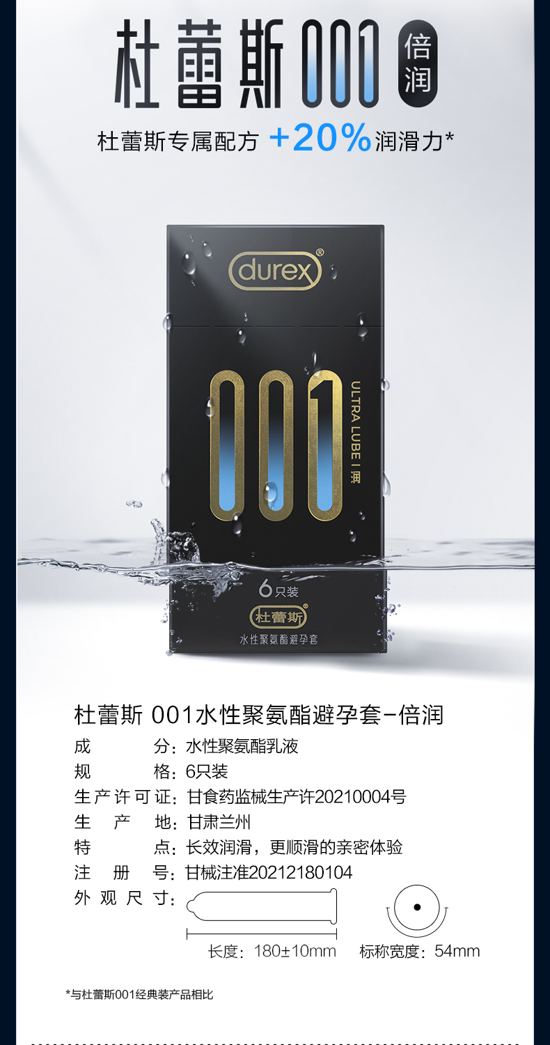 这款杜蕾斯001避孕套是旗下最薄的避孕套,号称是“000”,有着仿若未戴的超薄感受,关键是薄度均一,耐拉伸不易破,高于行业标准HG/T 5456 150%拉伸力。