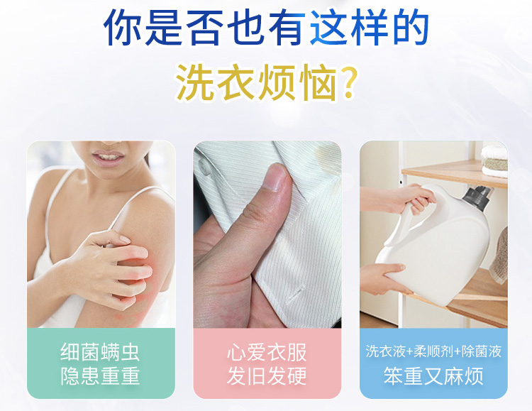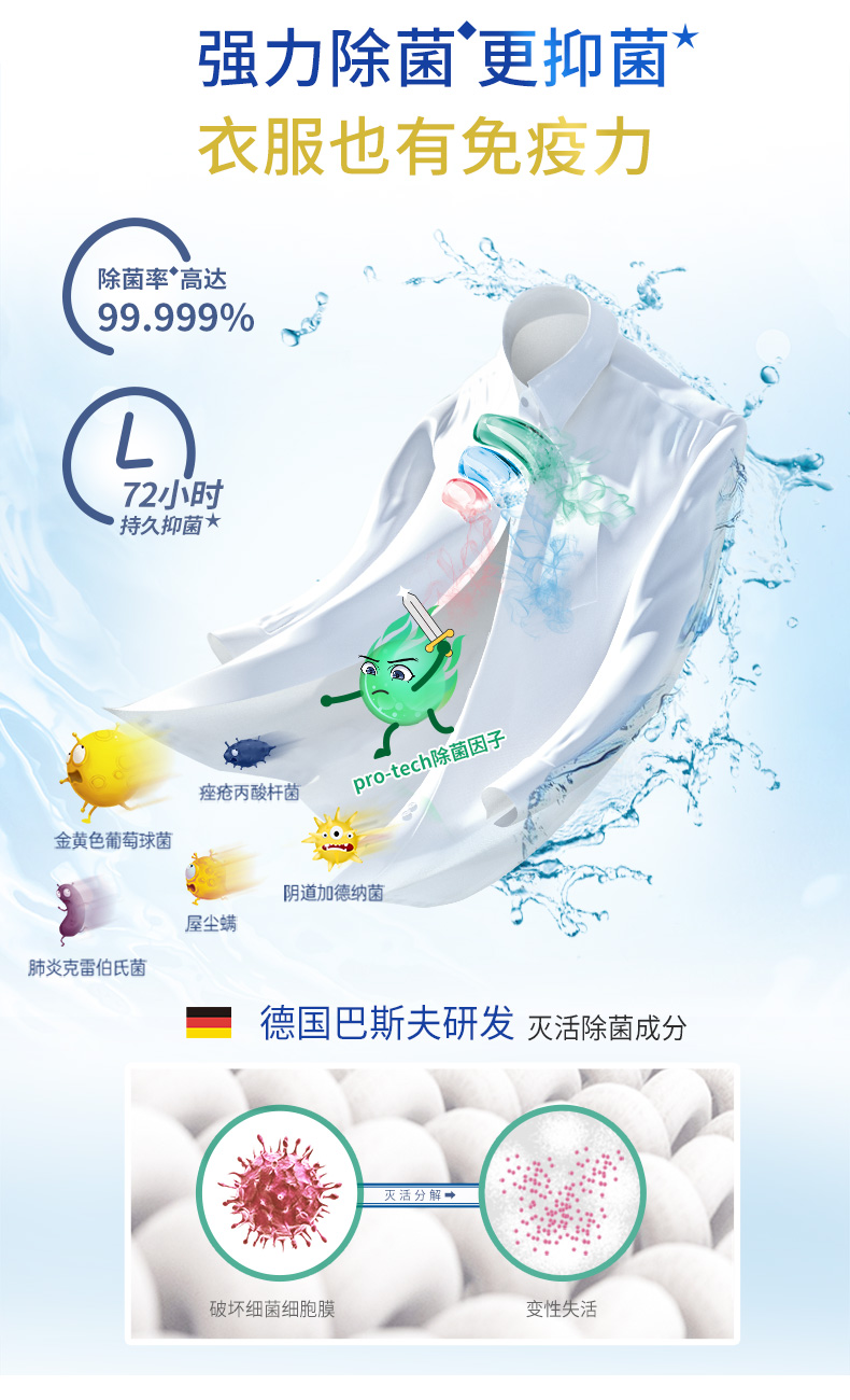 绿色:Pro-Tech除菌因子、99.999%除菌率,粉色:CSS柔顺因子、柔顺衣物持久留香,蓝色:万亿洁净酵素分子,轻松去除如奶渍、血渍、汗渍等。