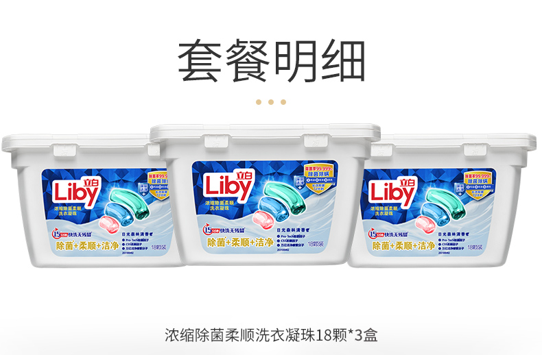 18粒*6盒,一粒10g大粒装,包含三种洗衣液,除菌、洁净、柔顺三效合一,8倍浓缩,可洗6斤左右,8-10件衣服;