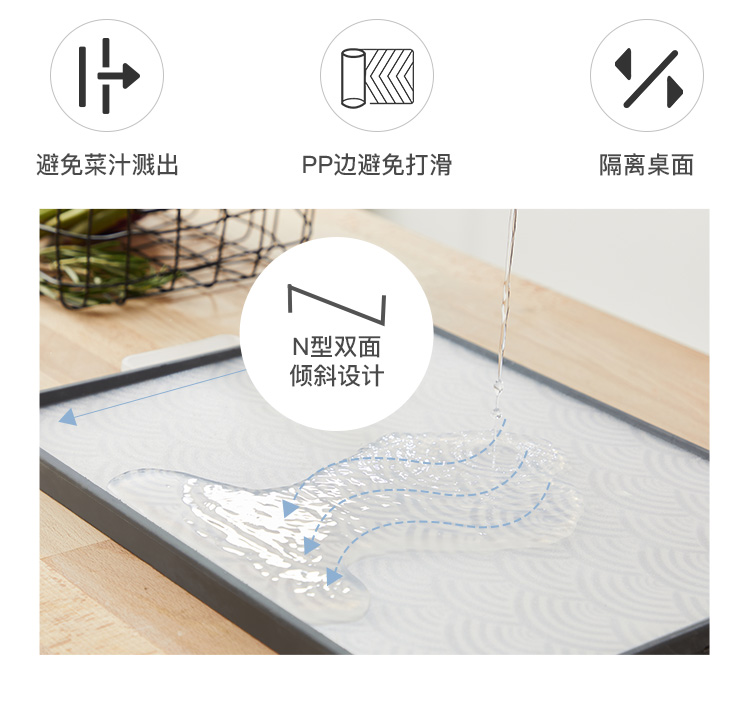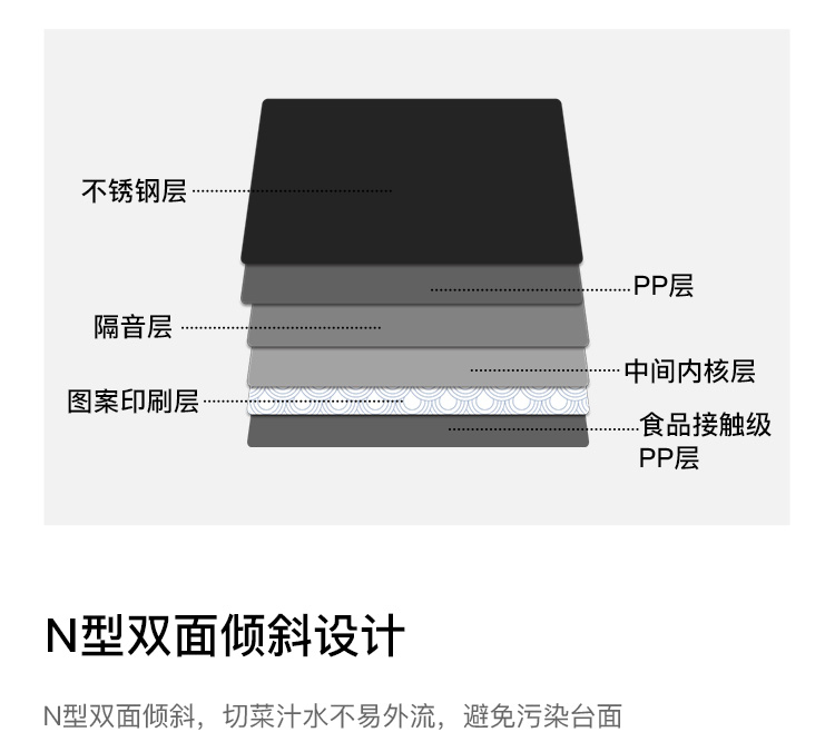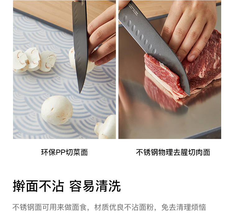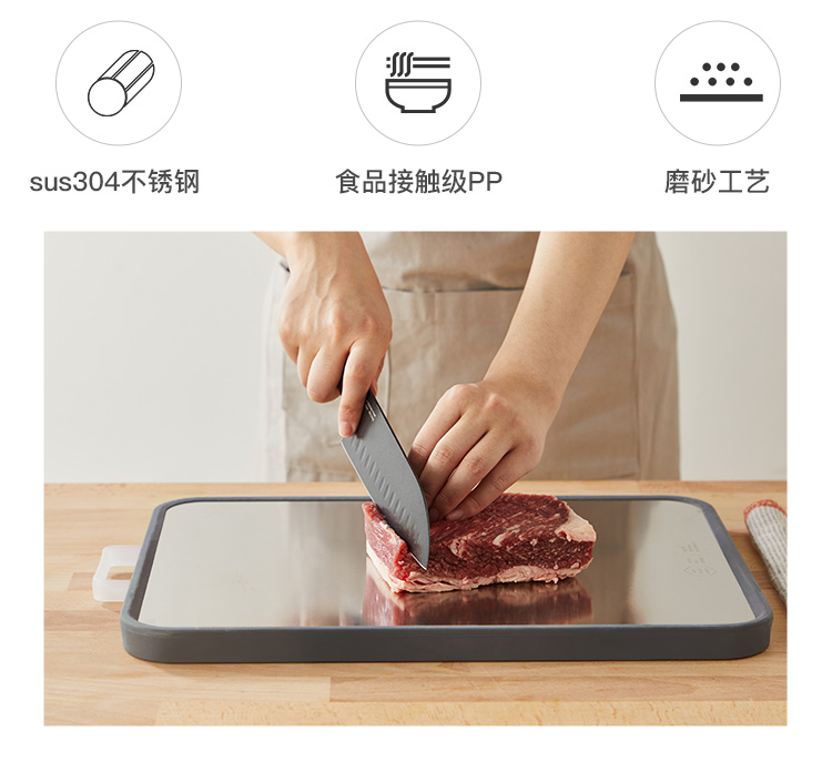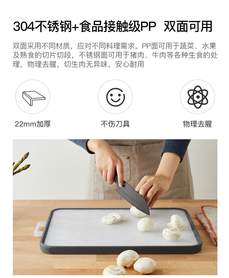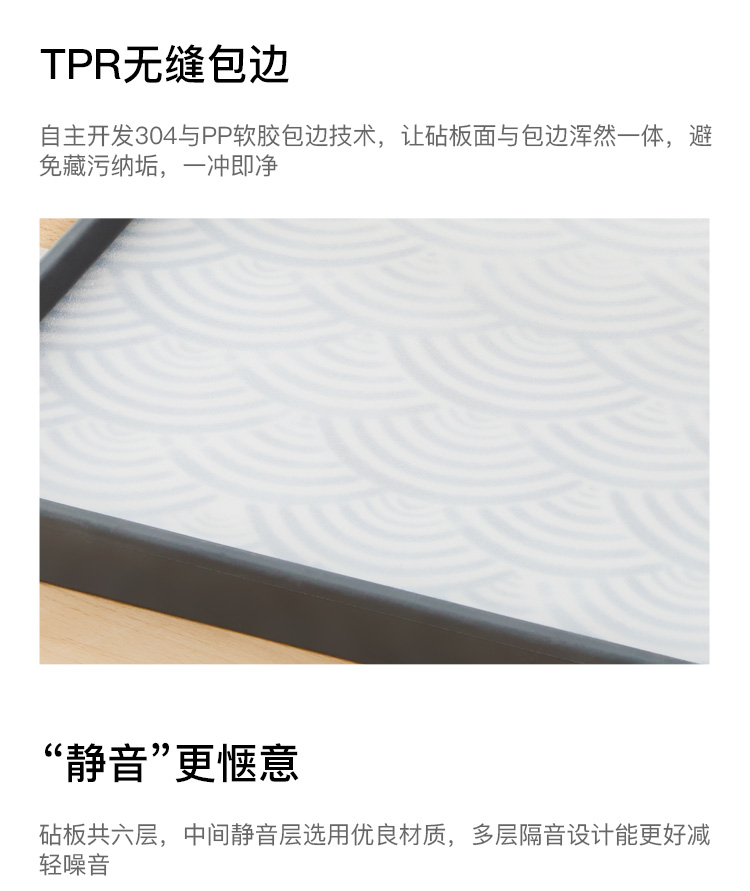 这款是第二代的加厚款,相比于初代,第一是变成了双面,正面304不锈钢、反面PP材质,中间加了一层木板材质,更厚更实用;第二是周边增加了一圈TPR橡胶,使菜板不与台面直接接触,更卫生,同时汁水不易外流。