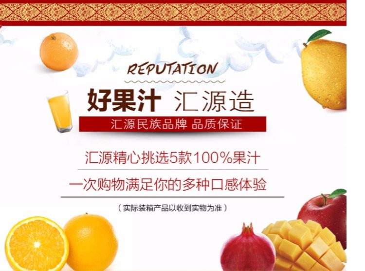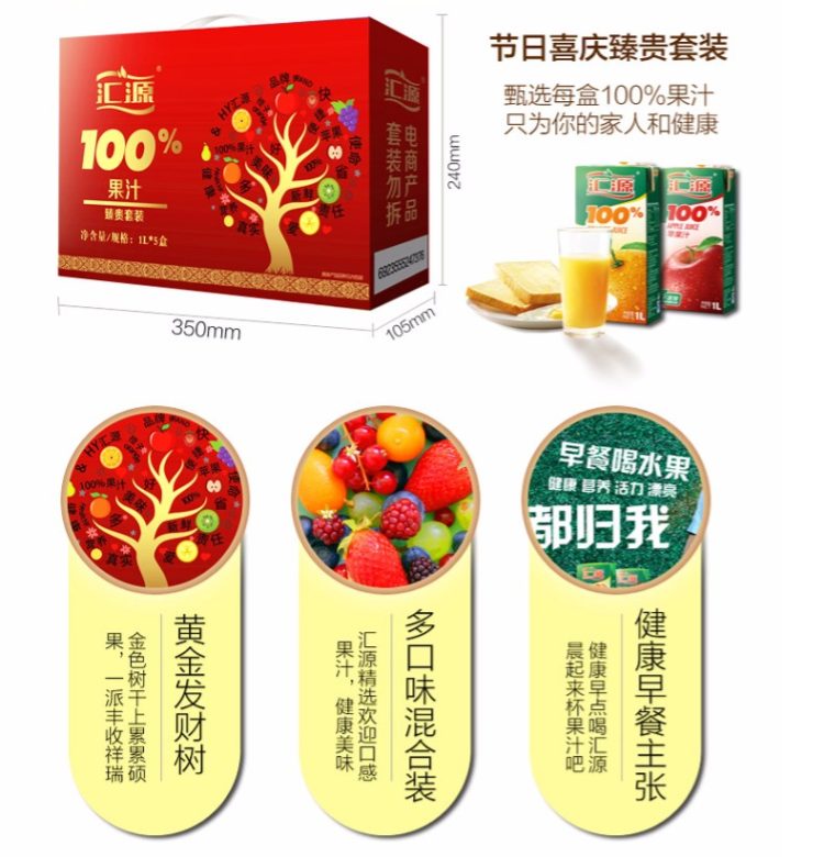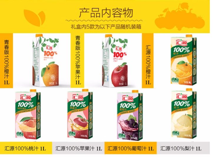 这款汇源 100%果汁饮料,有橙汁、苹果汁、桃汁、葡萄汁味可选,以新鲜成熟的水果为原料,经过科学方法榨取提纯,在制成过程中不如添加色素、糖精、防腐剂,在无菌环境中采用复合纸包材进行包装,最大程度的保证新鲜,规格是1L*5盒。