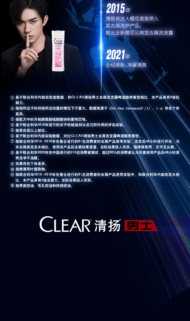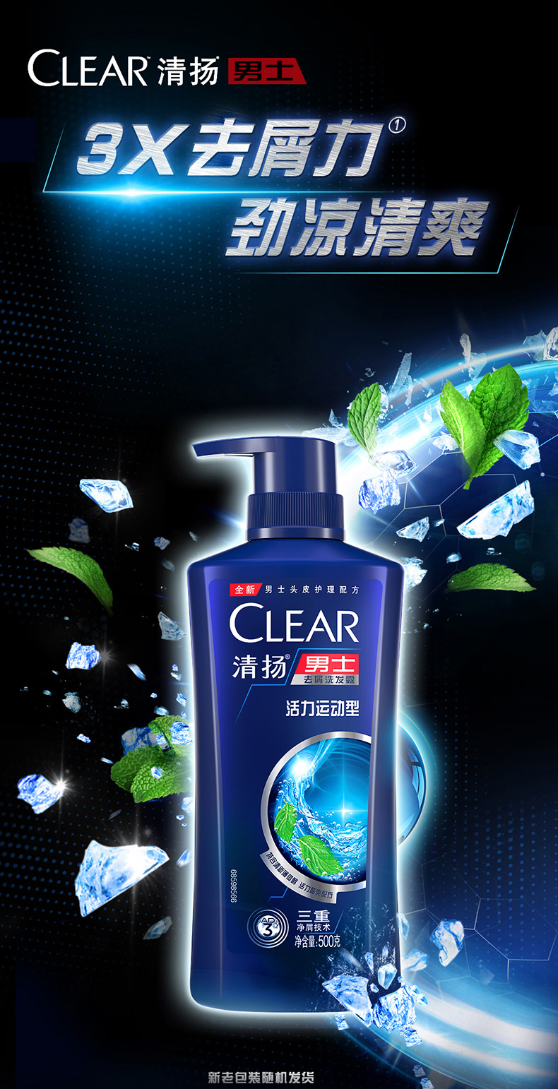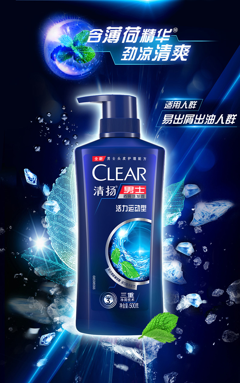 清扬活力薄荷运动洗发露,专为男士设计,含有双重去屑成分,强力去除头皮屑;同时特别蕴含的氨基酸和维他命B3,能清洁头皮毛孔,有效防止头皮屑的产生。