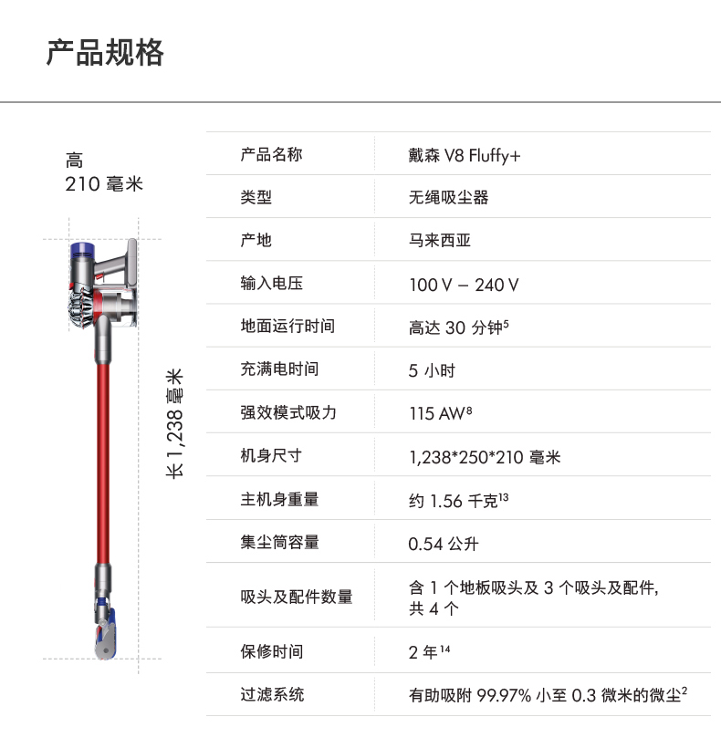 充电式设计,使用时免除线缆困扰;5小时充满电,可运行40分钟,有人觉得不够,但是其实吸尘操作本来就吸吸停停的操作,足够使用了;标准模式吸力 22AW,强效模式吸力 115AW,集尘盒 0.54L,产地是马来西亚,充电电压是100-240V,国内使用无需变压器,集尘网、滤网和吸头均可拆卸水洗。