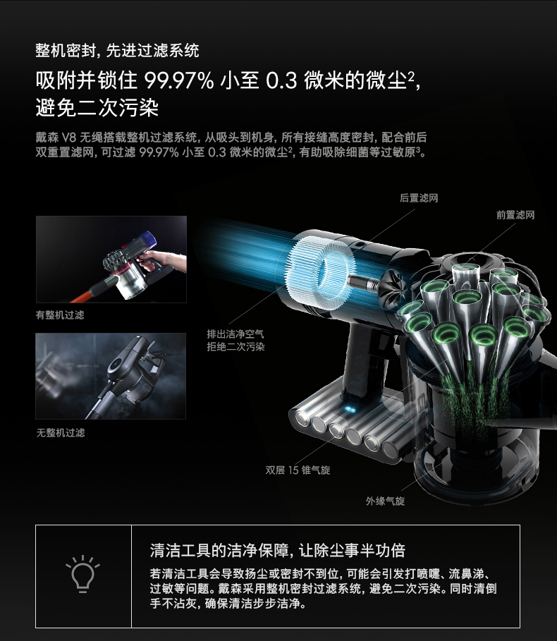 原有的Tier Radial 放射式气旋结构,结合整机HEPA过滤系统,能够吸附99.9%小至0.3微米的颗粒物,带上后置的马达滤网,使V8排出的空气更为洁净。全新的集尘筒清空设计也是亮点,新的清空集尘筒设计只需上拉红色按钮,就能一步清空尘垢和碎屑,无需接触尘垢。噪音方面,比起上代减少一半。
