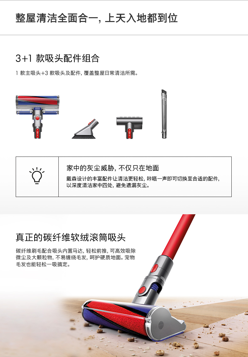 如果想搞明白戴森各吸尘器的差别,需要把吸尘器的“机身”,与“吸头”分别看。戴森吸尘器很贵,但实际上吸尘器本身价值约150美元,而戴森吸尘器的主力吸头,单个就要100美元,戴森各款吸尘器,实际上就是吸尘器的“机身”搭配不同种类的吸头,适合不同环境使用,产生的价格差异。