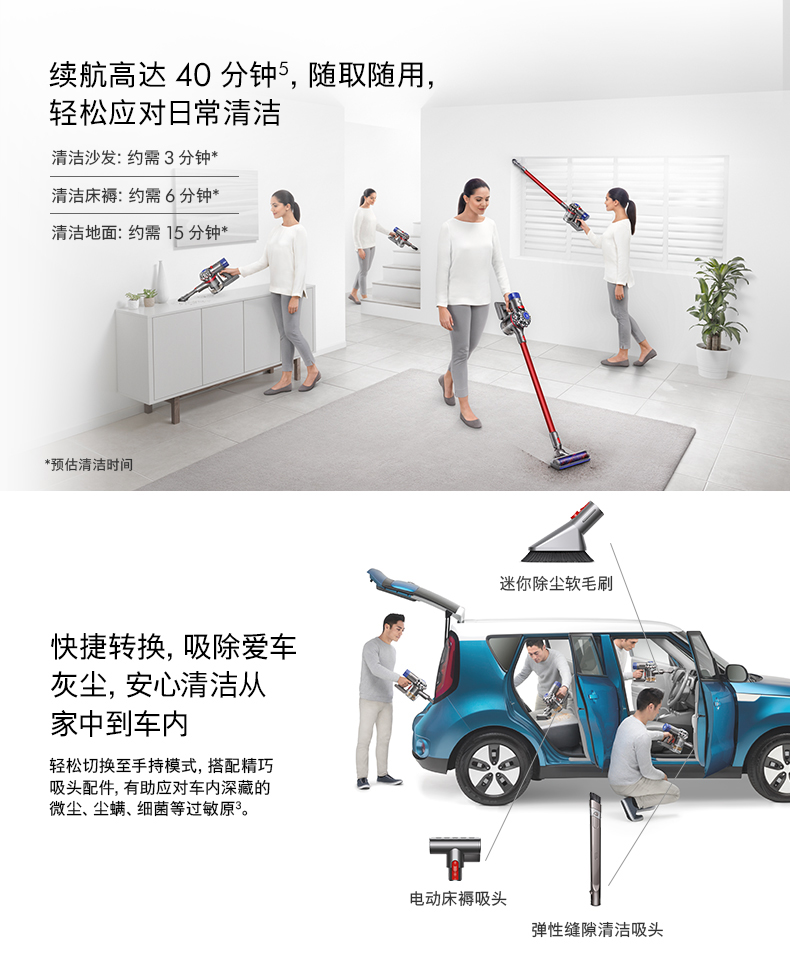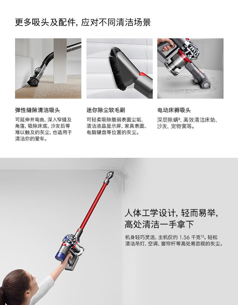 首先是主机,采用戴森第八代数码马达,比起V6的第六代马达,吸力更为强劲。清洁范围不仅限于光滑地板,在地毯/缝隙/床褥方面也有不错表现。比起V6,V8采用了6个无衰减锂离子电池供电,运行时间提升至40分钟,机身带有电量指示灯。