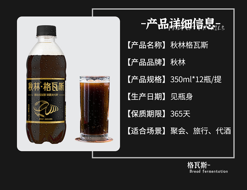 此款为秋林开发新品格瓦斯饮料,采用黑麦芽+俄式大列巴发酵,赤藓糖醇代替蔗糖,不伤牙齿不会给身体带来负担,非勾兑0色素0蔗糖0脂肪,酸甜适中,相比普通款风味更佳浓郁,冷藏4℃口感更佳。