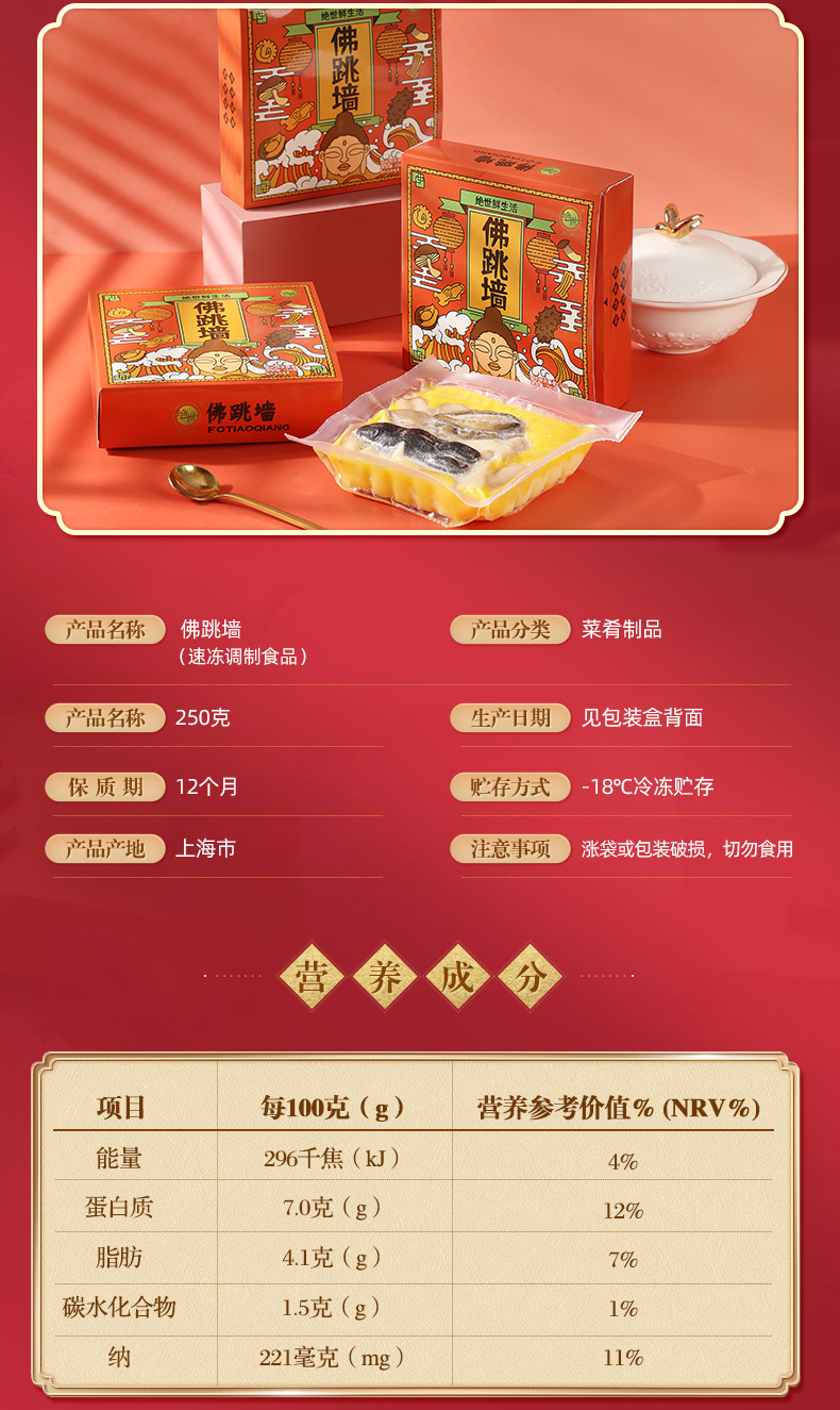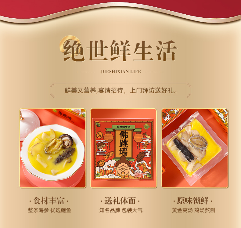 这款绝世 加热即食佛跳墙250克装,食材包括海参、鲍鱼、杏鲍菇、花胶、香菇、螺肉、蹄筋和干贝,高汤熬制12小时,鲜香浓郁,肉质紧实,参体爽滑,胶质饱满,口感黏腻,鲜香扑鼻,细嫩鲜美,加热即食,回甘不燥,浓郁不腻。领券链接点此