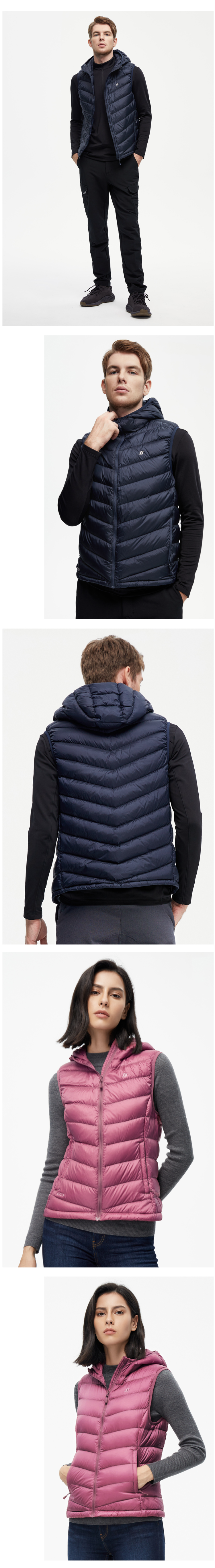 这款君羽云色立领羽绒马甲,是2021年的秋冬新品,外层是20D高密度锦纶面料,可防风防雨雪。内里填充了800蓬90%鹅绒,充绒量男L码56克/女M码48克,适合室内单穿,或者作为中间保暖层。
