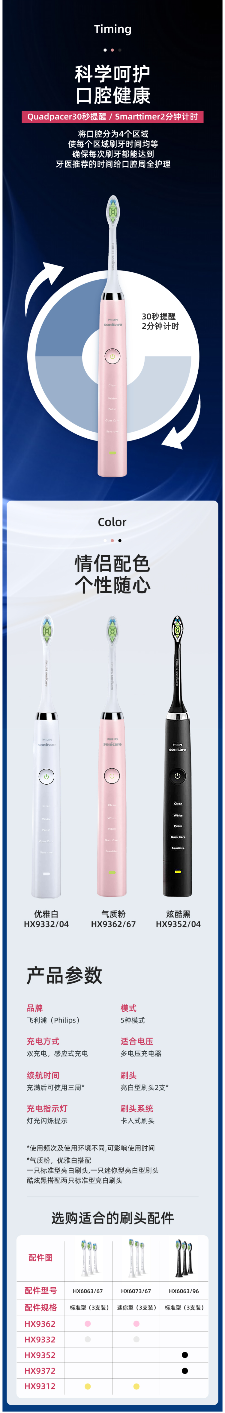 飞利浦钻石亮白电动牙刷的功能与配置: