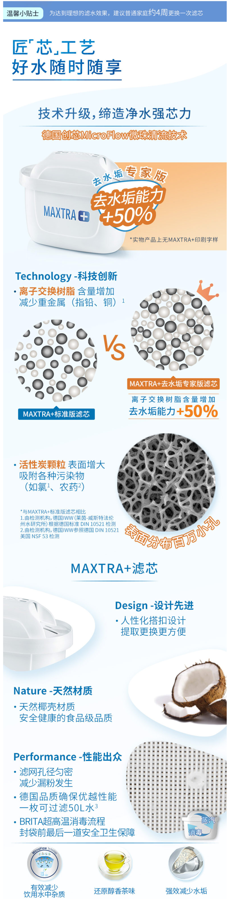 这款碧然德 第三代 MAXTRA+ 去水垢专家版滤芯,是专门针对中国水质研发设计,与MAXTRA+标准滤芯相比,减少水垢能力提高50%,这一效果的技术支撑来源于离子交换树脂含量的增加。