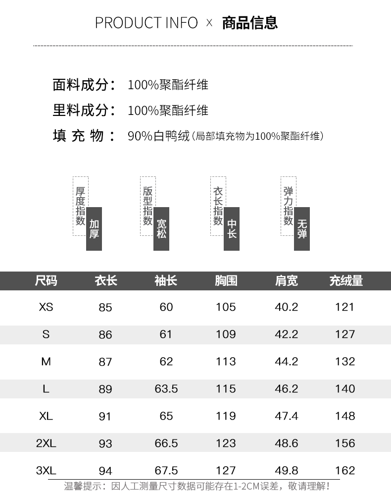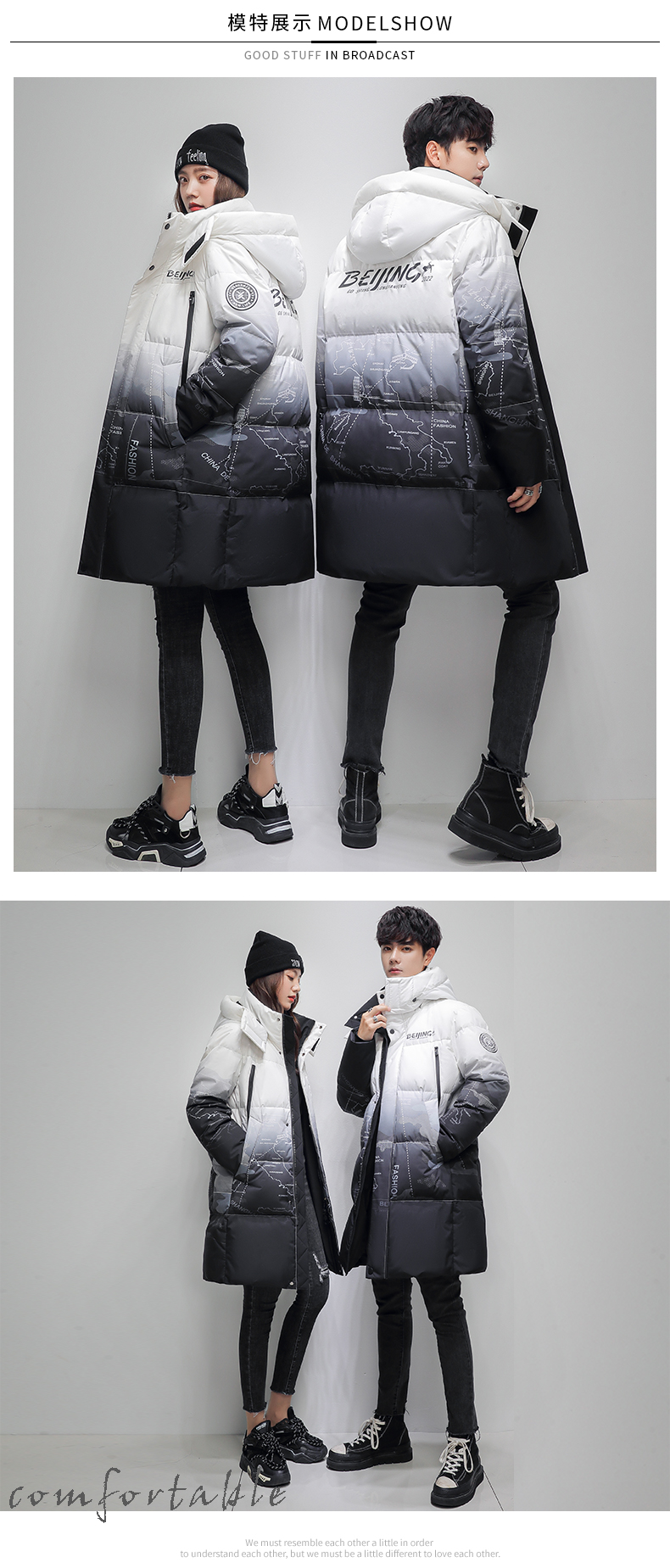 细节上:3D立体剪裁,合体版型,穿着挺括不臃肿,包容任何身型,防风帽可拆卸设计,加高立领防风保暖,拉链+按扣双重门襟,防钻风增强保暖性,抵御寒风温暖过冬