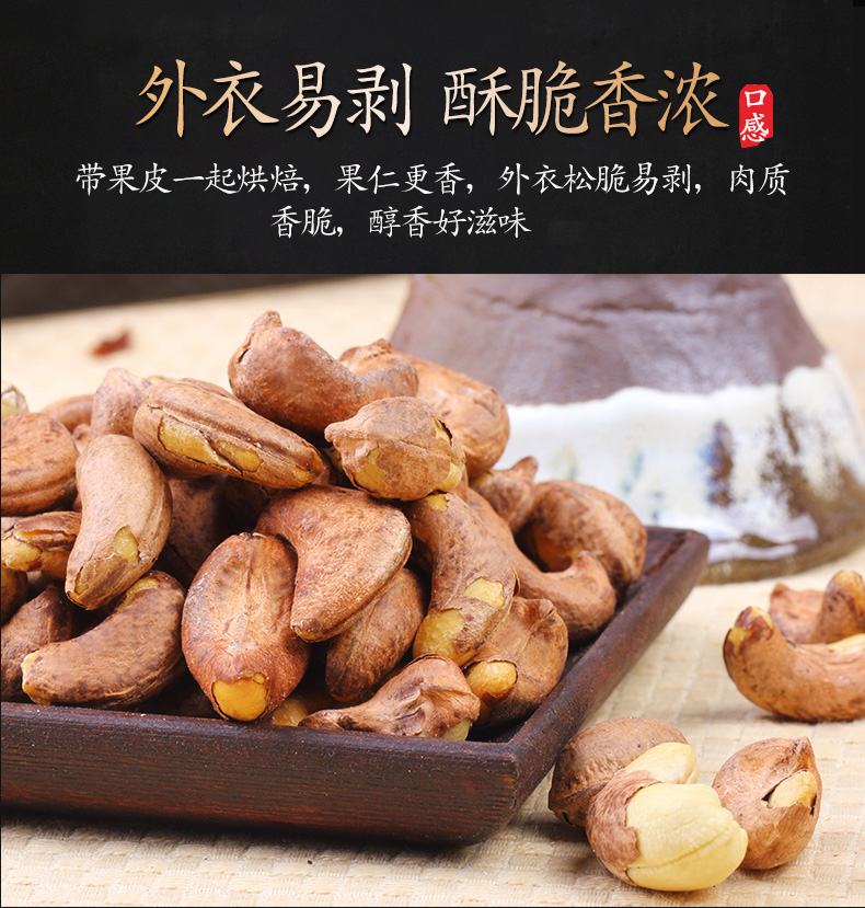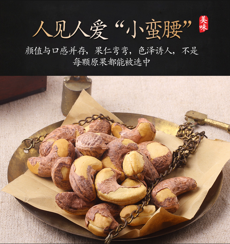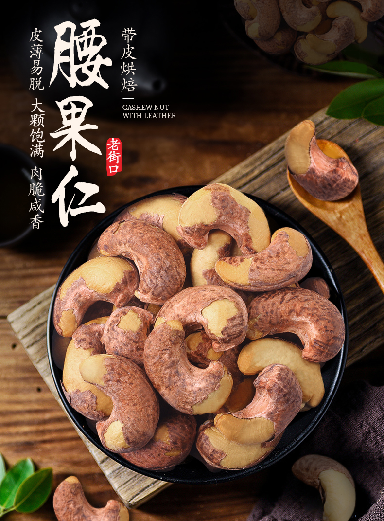 老街口大牌子,甄选W180腰果,带皮烘烤,充分保留原味,皮薄易脱,少盐烘培,肉脆咸香,个大肉厚,饱满有分量,无添加剂,醇香酥脆,罐装配送更好的保护果仁完整!