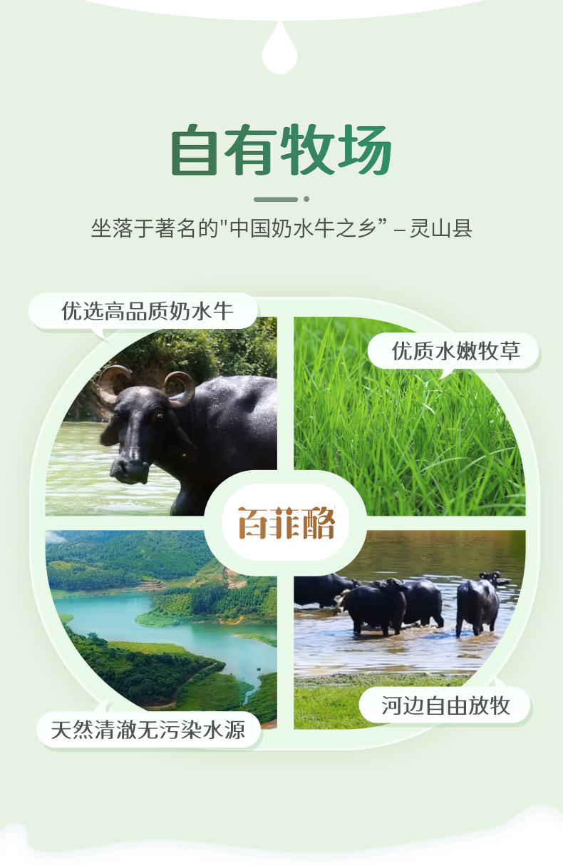 水牛纯奶是普通奶牛产量的1/4,双倍的营养,1/5的胆固醇,再加上比普通牛奶更多的蛋白质、钙、氨基酸和微量元素等,绝对的奶中珍品!