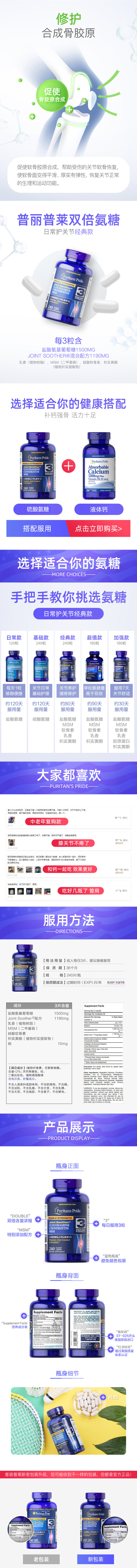 规格240片/瓶*2瓶,每三片的氨糖成分为1500毫克,成人每天3粒,建议随餐服用。