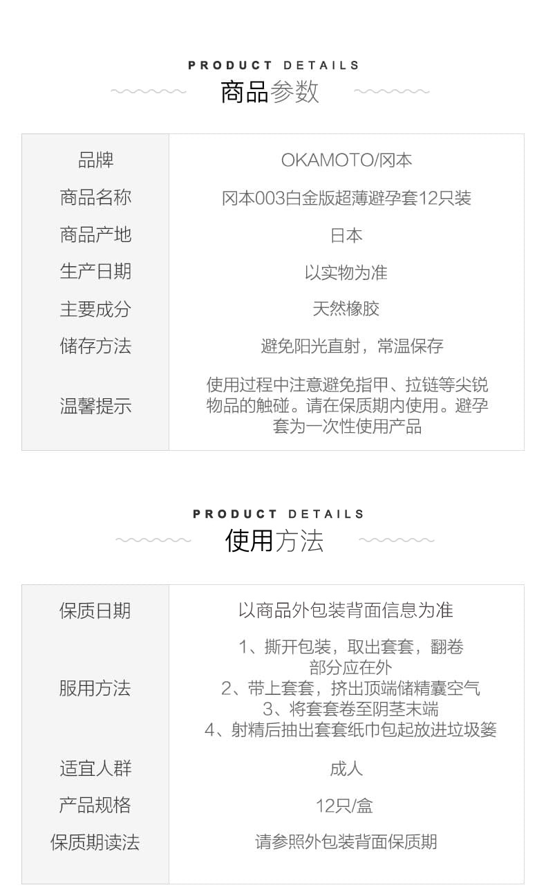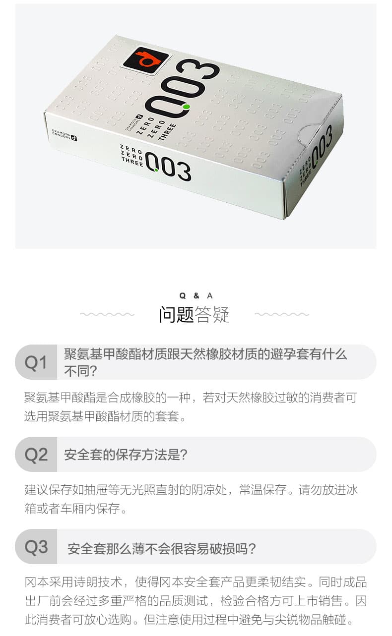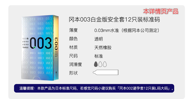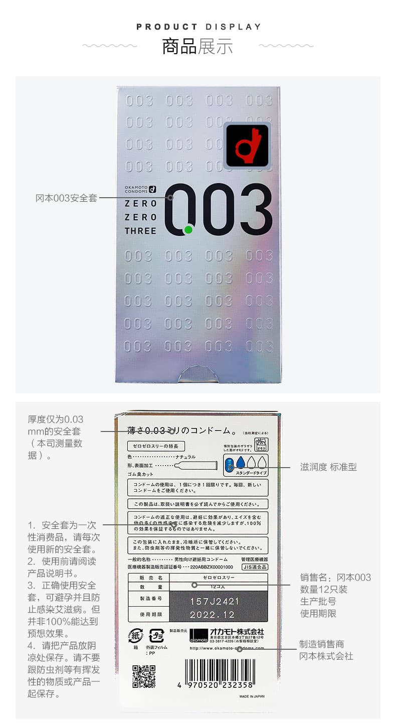这款冈本冈本003是日本原装的,冈本003确切的说应该是冈本0.03,标称厚度为0.030mm,凸点厚度0.025mm,阔度为52±2mm,长度为172±7mm更符合亚洲人的Sizie,材质为乳胶和润滑剂,带给你接近不带的快感。