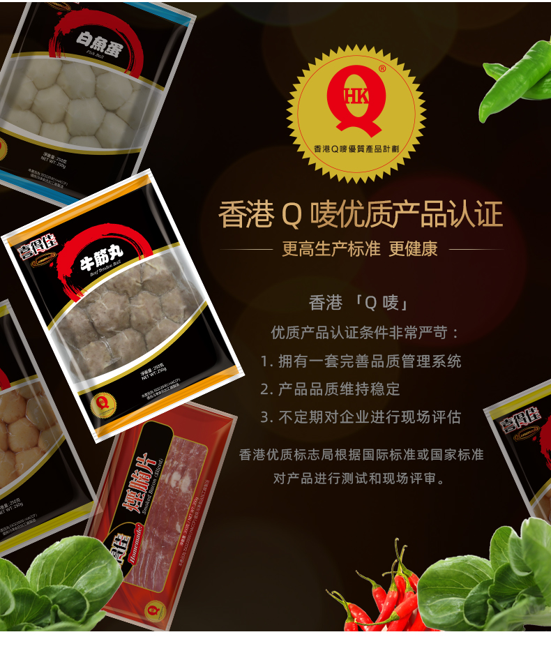 喜得佳 正宗潮汕 手打实心牛肉/牛筋丸,获得了香港Q唛认证,品质安全有保证。选用自然放养黄牛的新鲜后腿肉,纯手工捶打成酱,肉质细腻鲜嫩,Q弹多汁,爽口弹牙,能当乒乓球打,弹性非常之好(跟电影《食神》中的爆浆撒尿牛丸相似),不含硼砂、弹力素、防腐剂,口感筋道,爽口又弹牙。