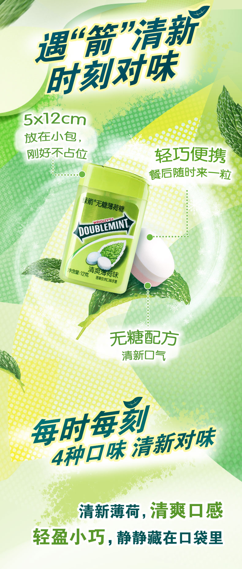 美国箭牌糖果有限公司(Wm. Wrigley Jr. Company)是国际糖果业界的领导者之一和全球最大的口香糖生产及销售商。绿箭薄荷味口香糖已经家喻户晓了,相信很多人都吃过,既可吃又可玩,深受儿童和青年人喜爱。同时也成为大部分年轻人的扮酷、时尚的新宠。这款无糖薄荷糖混合口味,有薄荷、冰柠、茉莉花茶种口味,配料有食品添加剂、食品香料等,可清新口气,置于阴凉处储存。
